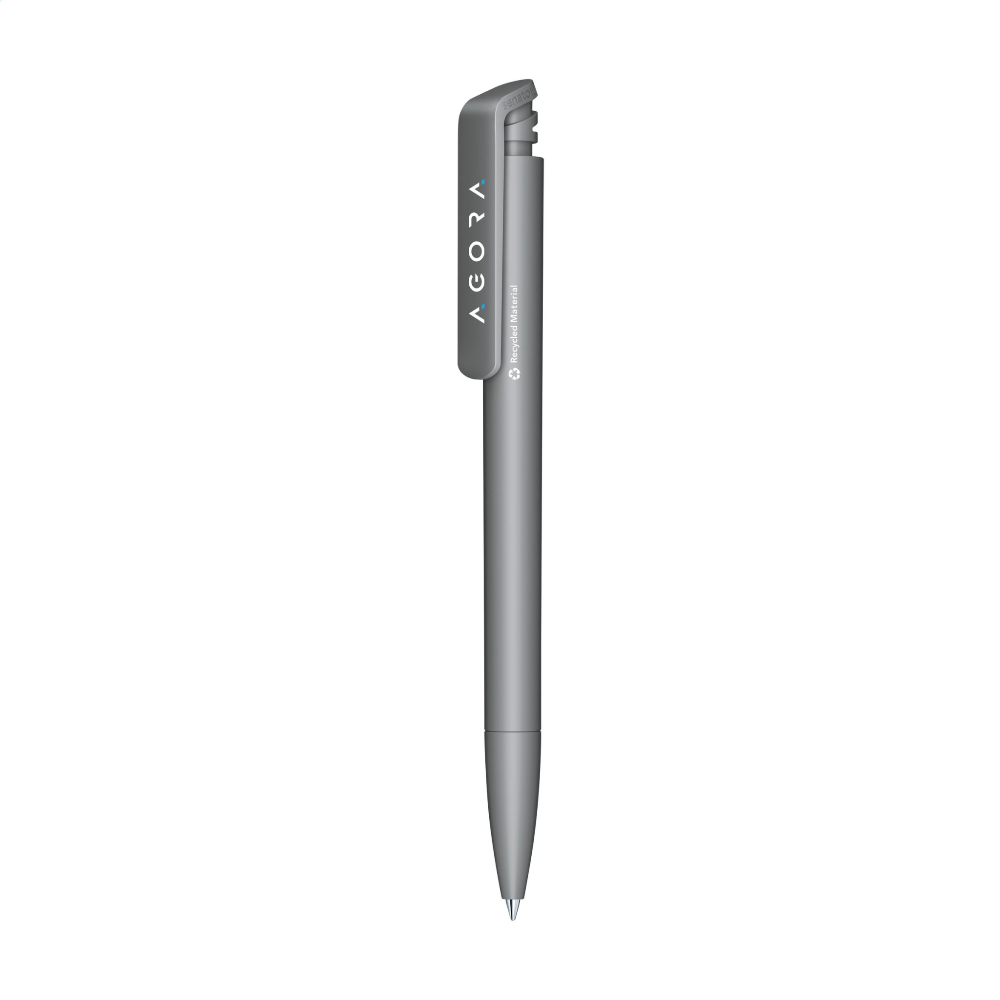 Blue ink ballpoint pen from the Senator® brand. Made from recycled material. This pen has a sleek, matte finish and a generously sized clip/push button. The barrel is printed with a small 'recycled material' logo, next to the clip. Due to the recycled material used, slight irregularities in the surface of the pen may occur. Made in Germany.