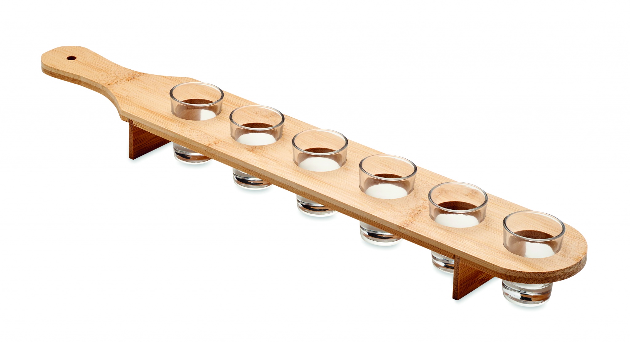 Set of 6 shot glasses on a bamboo paddle tray. Capacity: 20 ml. Bamboo is a natural product, there may be slight variations in colour and size per item, which can affect the final decoration outcome.