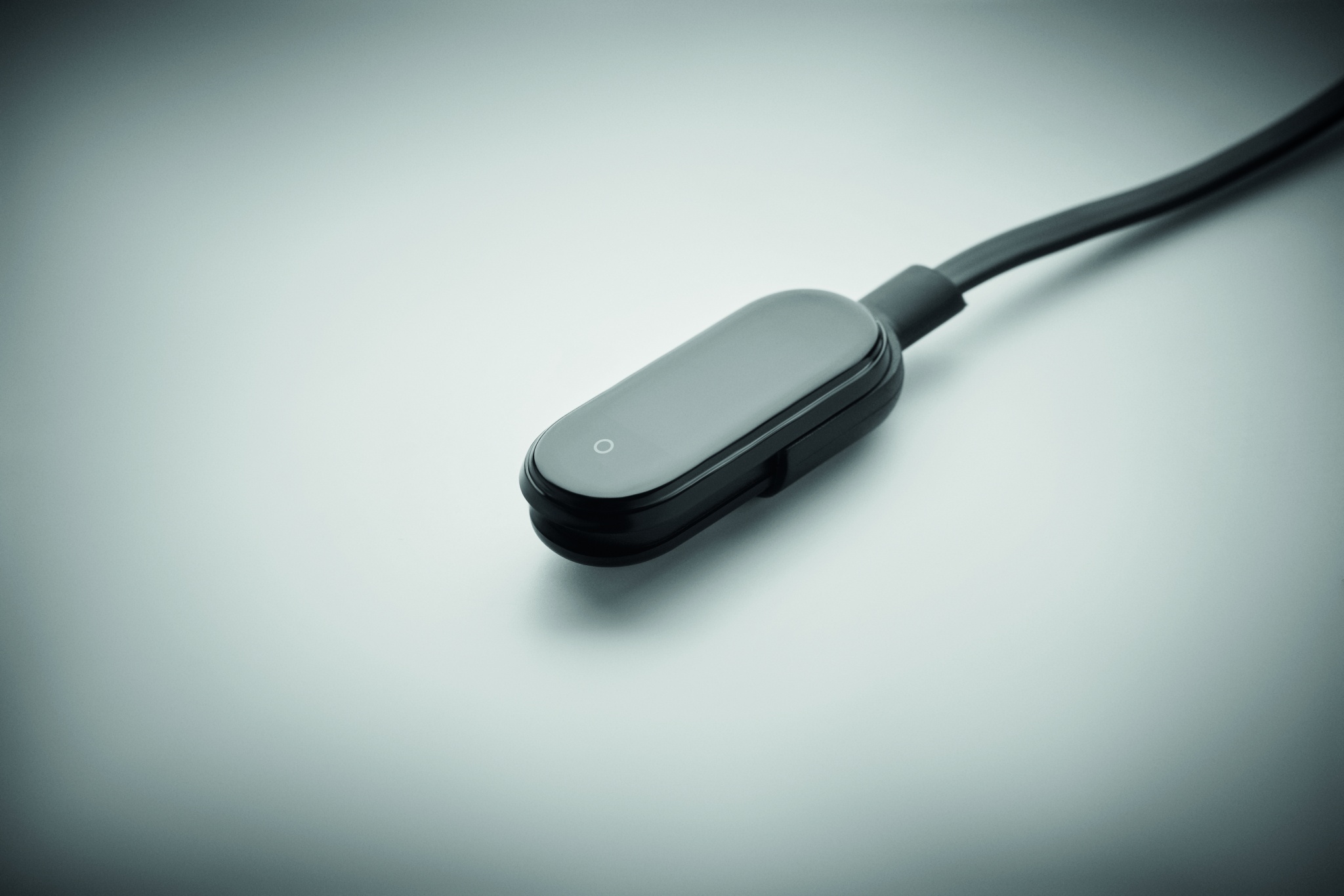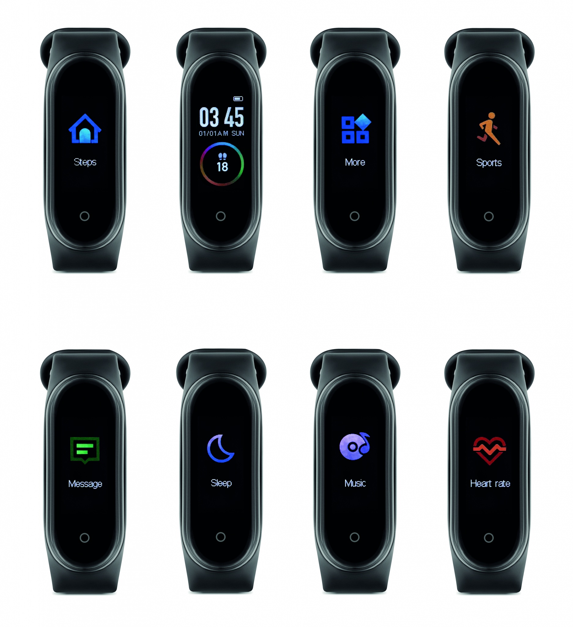 4.0 wireless smart health watch in ABS with silicone strap. 0.96 inch touch LCD display. Rechargeable Li-Pol 90 mAh battery. Requires a free app (HryFine available in both iOS and Android).