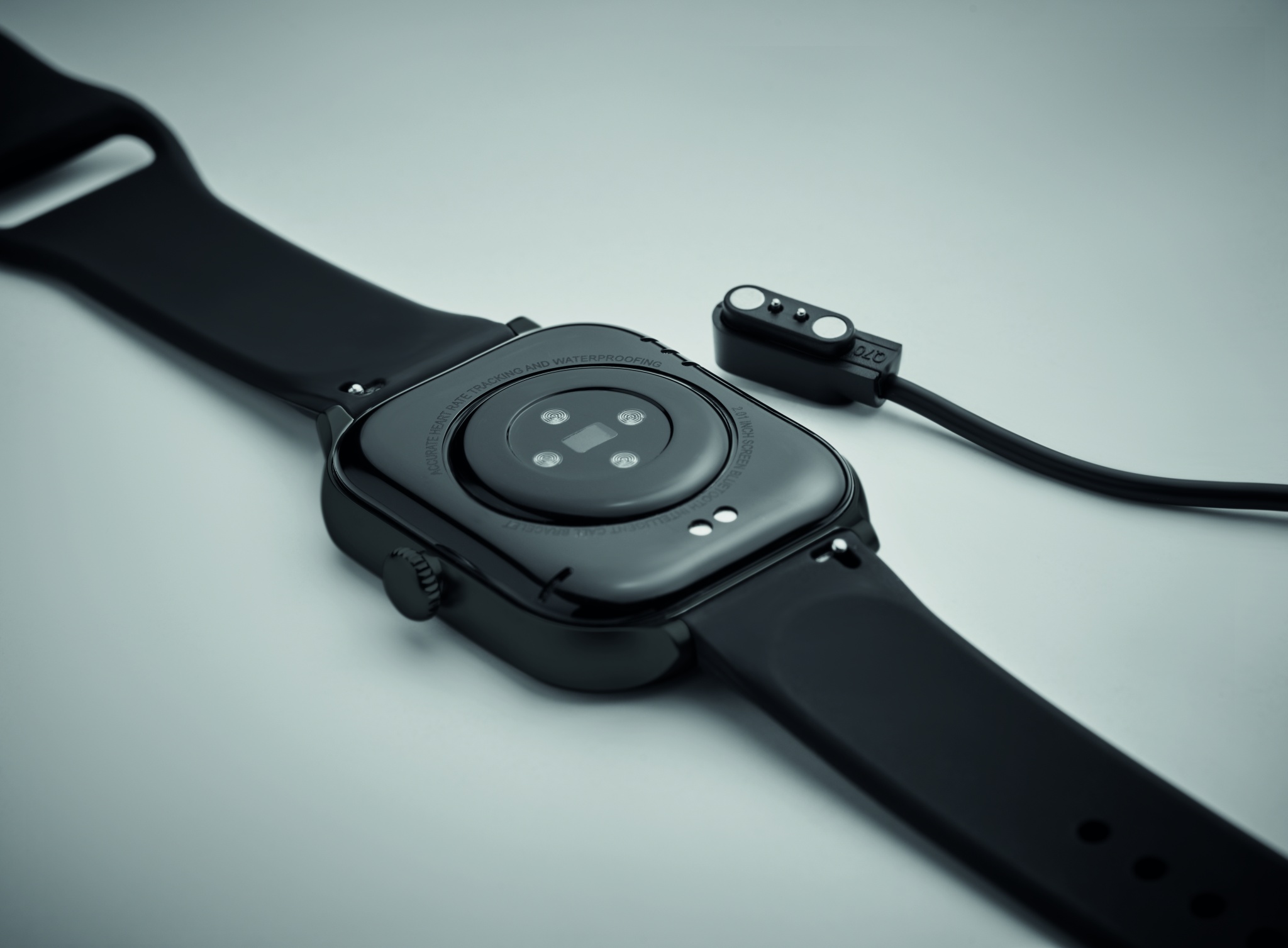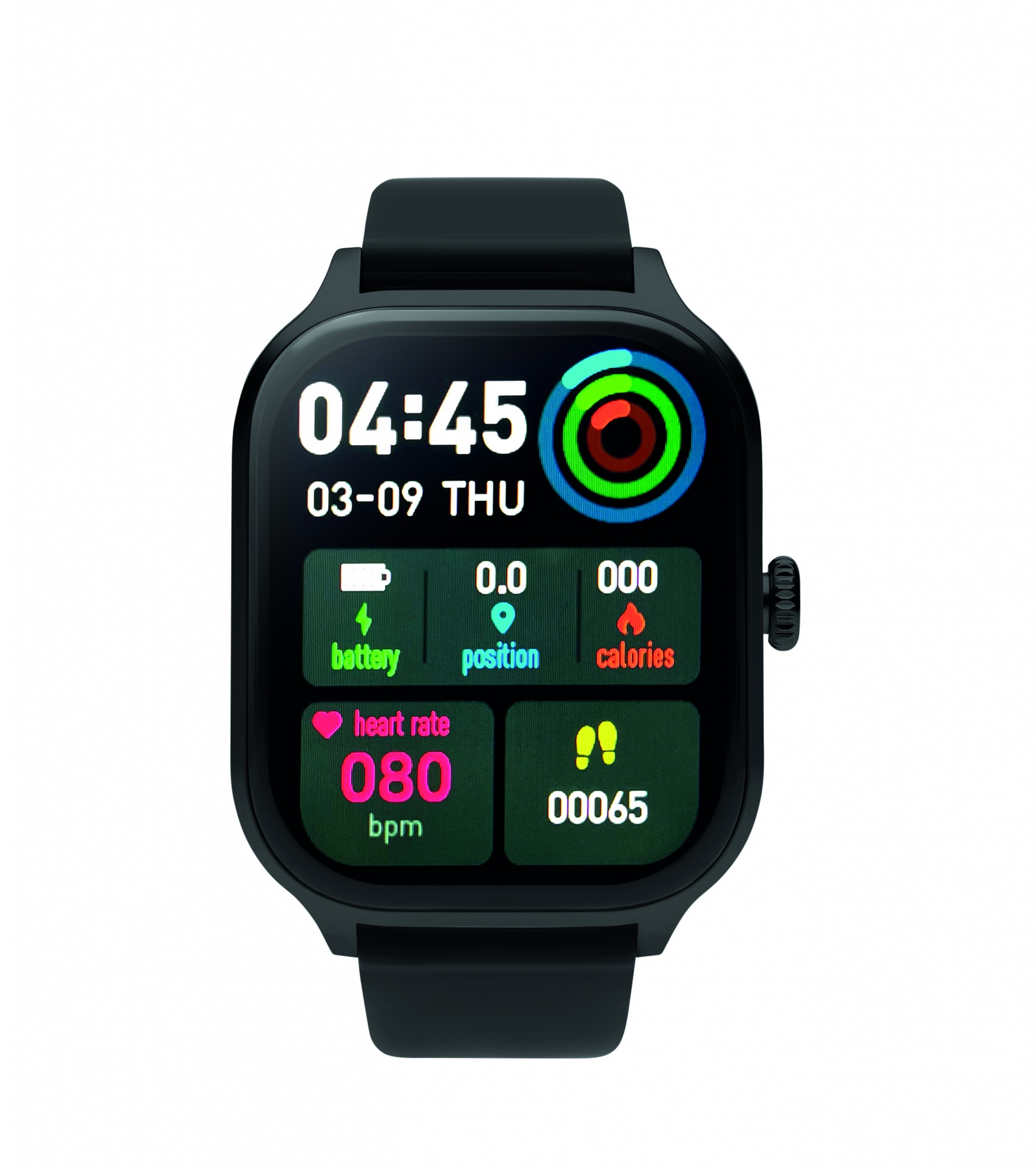 4.0 wireless smart health watch in zinc alloy with silicone strap. 2.01 inch touch LCD display. Rechargeable Li-Pol 180 mAh battery. Requires a free app (HryFine available in both iOS and Android).