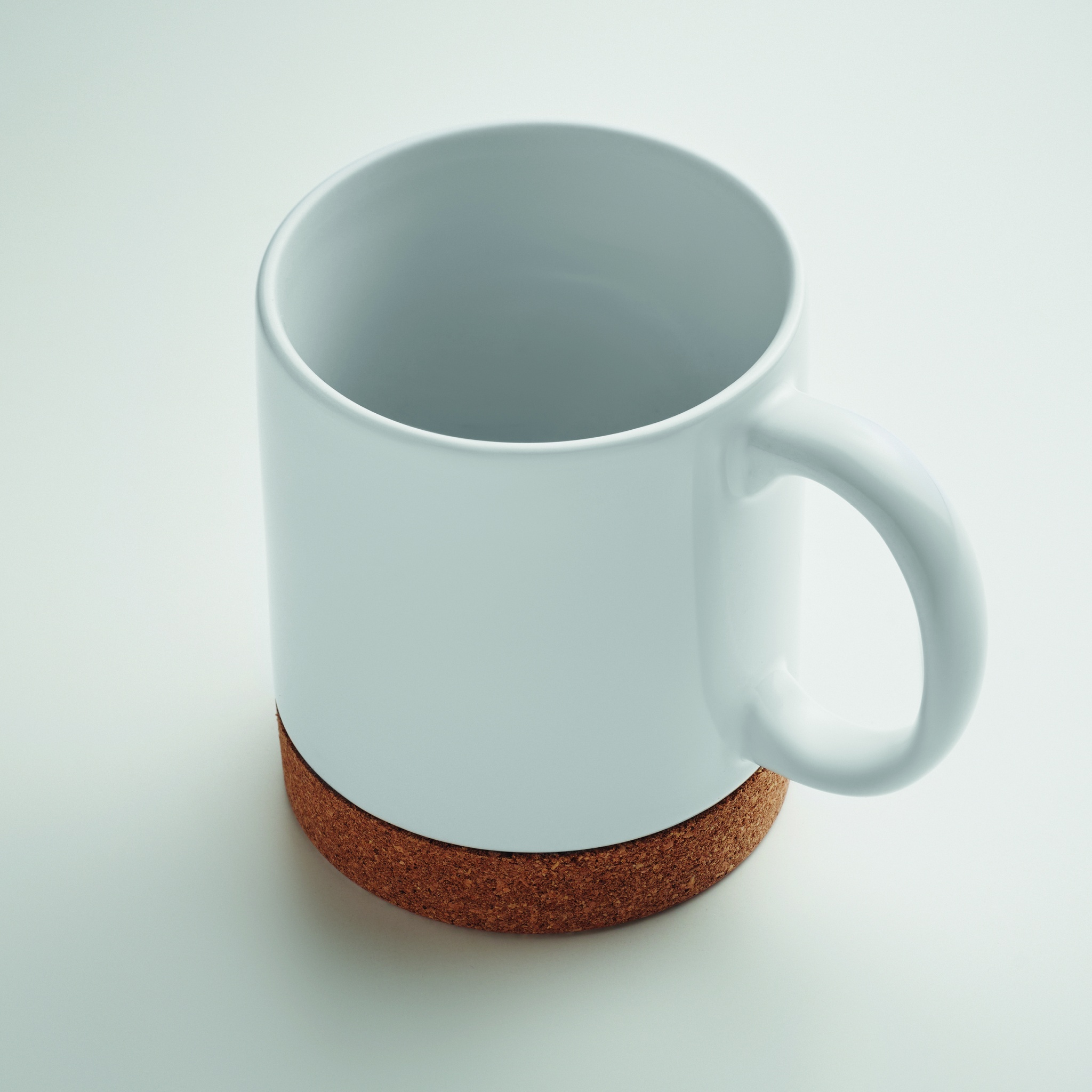 Ceramic mug with special coating for sublimation print and cork base detail. Capacity: 280 ml. Cork is a natural product, there may be slight variations in colour and size per item, which can affect the final decoration outcome.