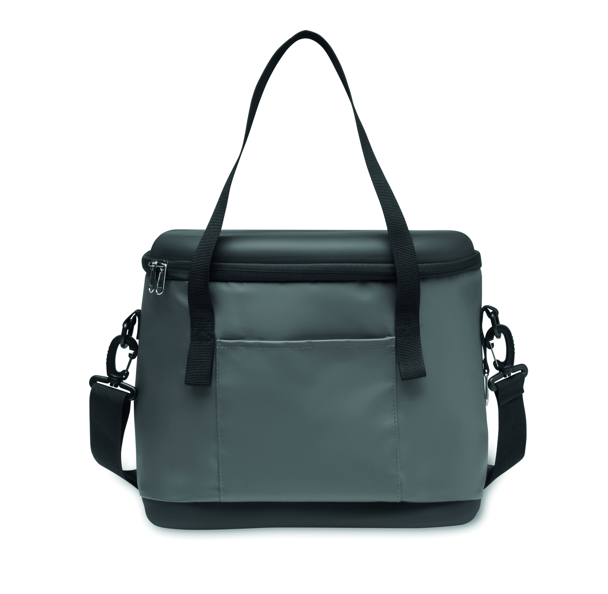 Cooler bag in 50C tarpaulin and top/bottom in rigid PEVA and bottle opener on the side. Including 1 front pocket and 1 inner mesh pocket. Isolation material: PE foam layer. Includes 2 handles and 1 adjustable and detachable strap. Capacity 40L.