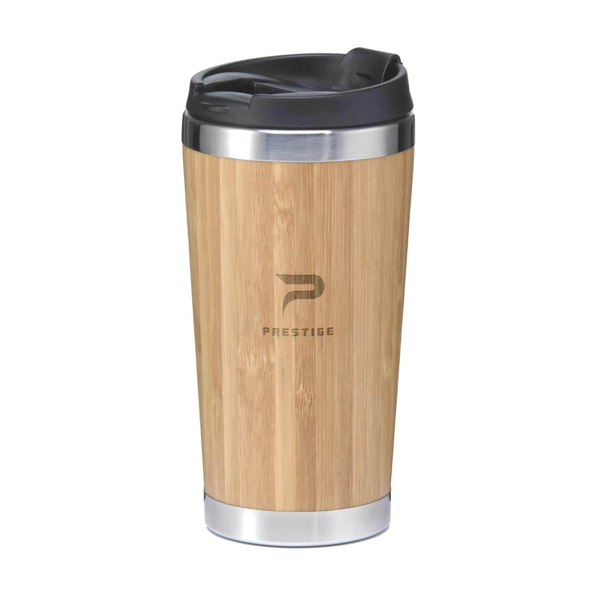 Double-walled thermos cup made from stainless-steel with bamboo finish on the outside. Features a screw lid, click opening and non-slip base. Capacity 450 ml. Each item is individually boxed.