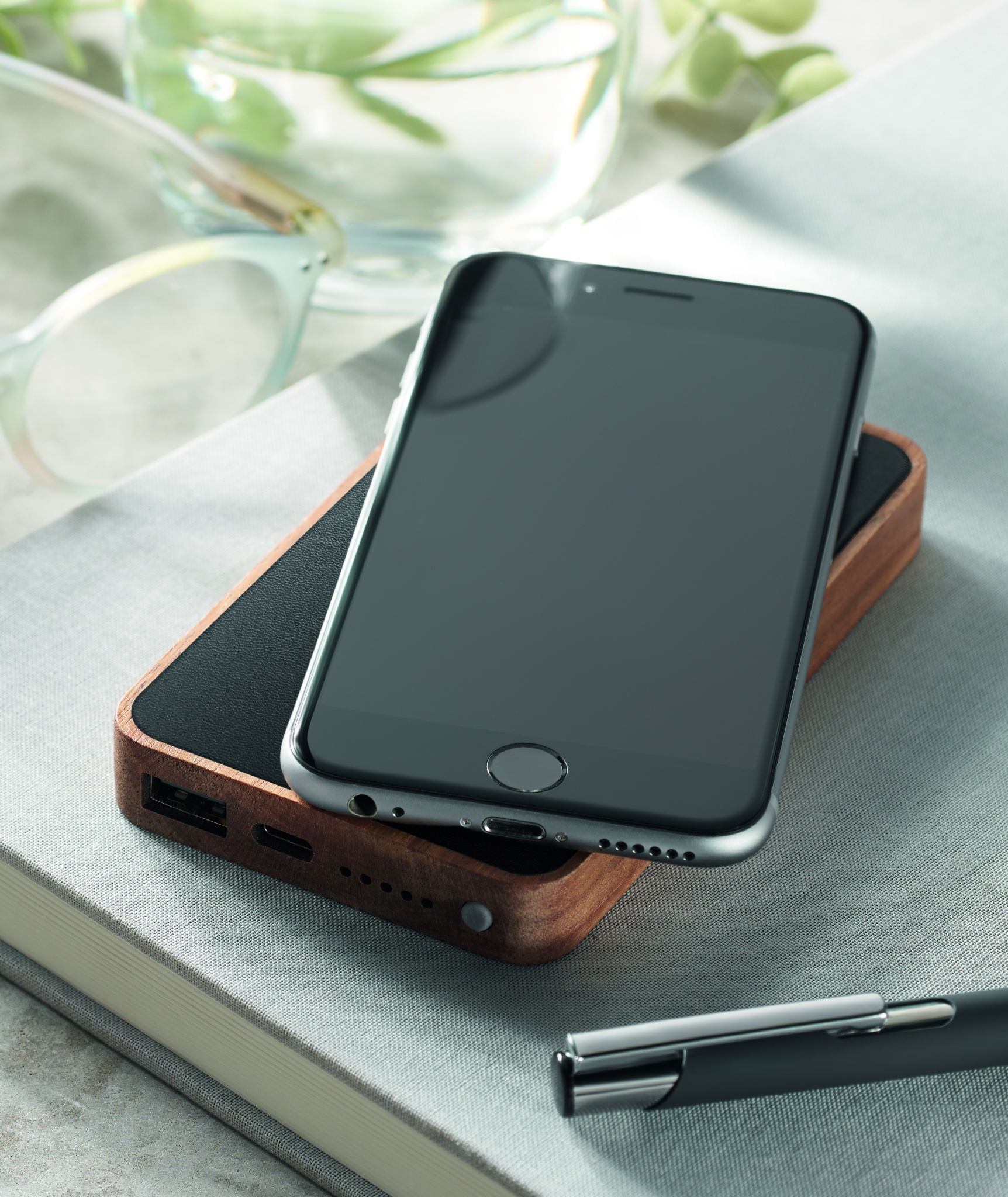 15W wireless charging and 4000mAh power bank with acacia wood casing and recycled PU, which is 58% recycled (40% recycled polyester and 18% recycled PU). Supports quick charging technology (20W). In/Output: Type-C.