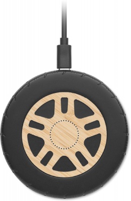 Wireless charger 15W in recycled ABS and bamboo top. Car tire design. Connect device to your computer, place smartphone on it and let it charge. Output: DC 9V/1.10A (15W) for quick charging. Compatible with all QI enabled devices such as latest Androids, iPhone® 8, X and newer.