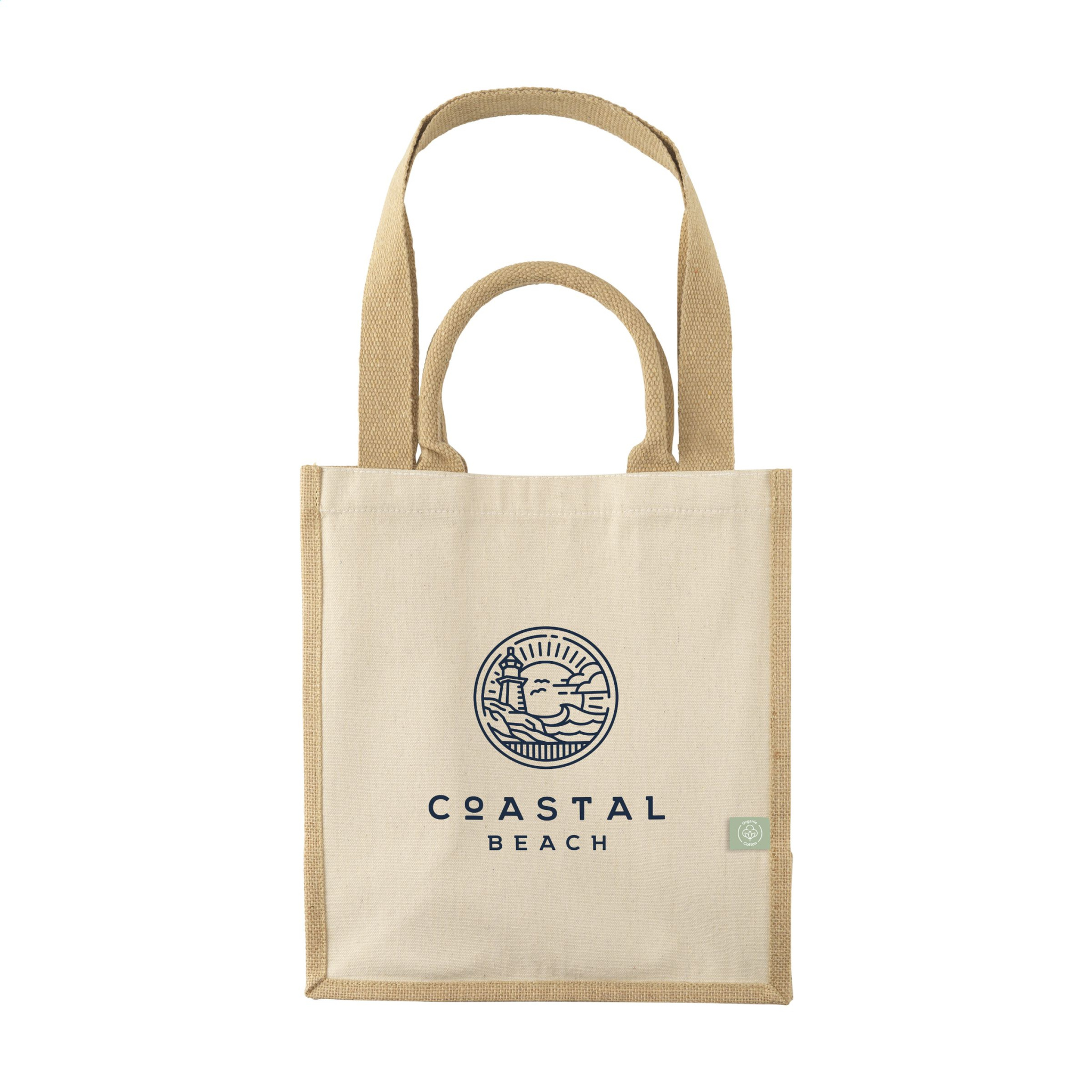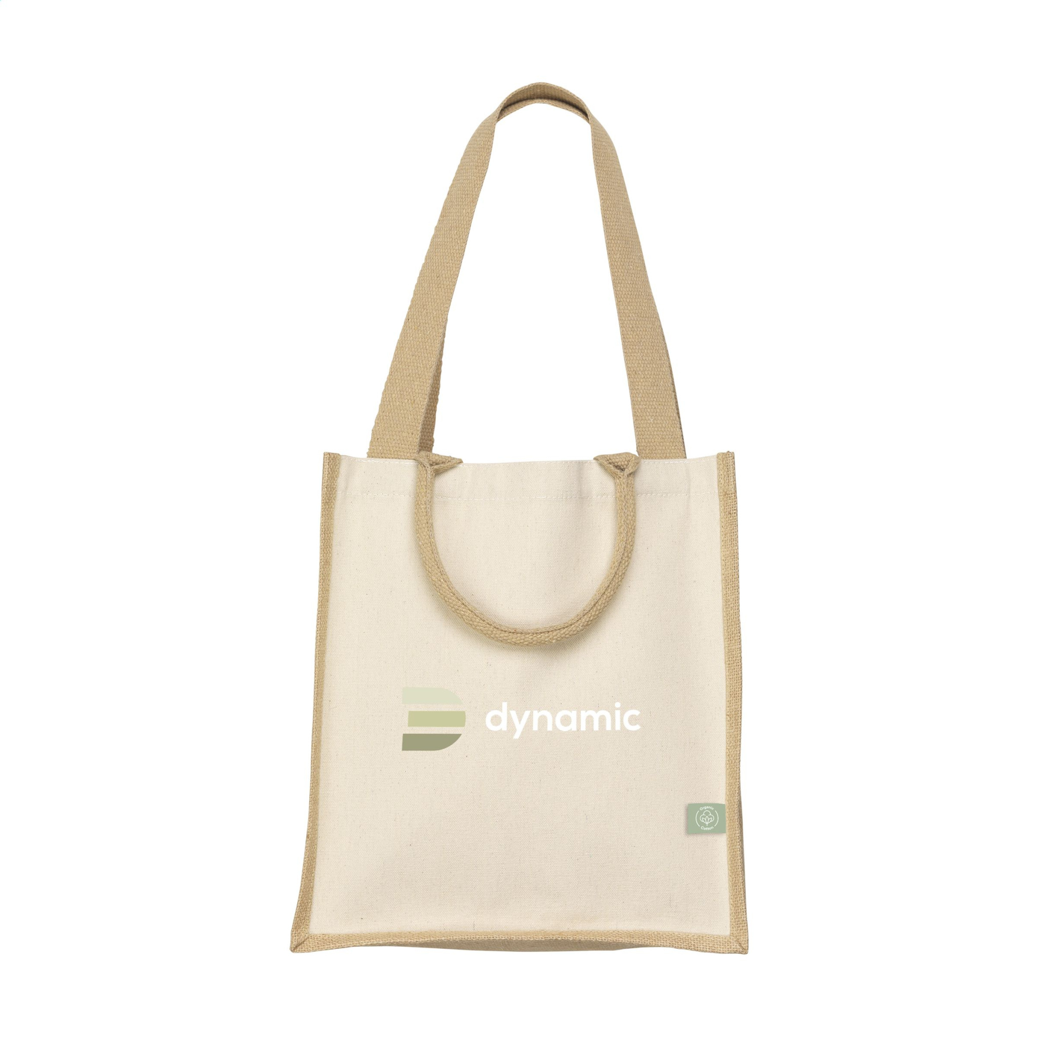 WoW! Shopping bag in natural colours and a material combination of sturdy jute and organic cotton (320 g/m²). With long and short handles. A sturdy shopping bag with a wide, laminated bottom. Ideal for frequent use. Capacity approx. 18 litres.