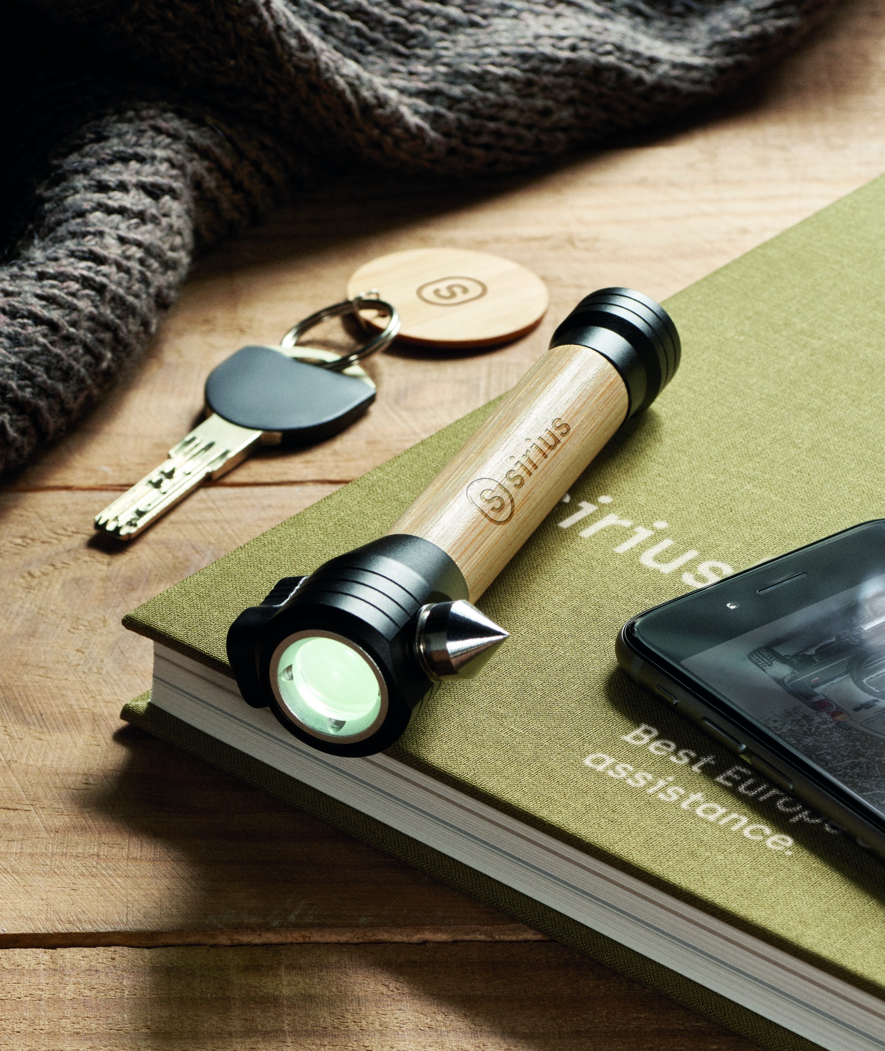 Logo trade ärikingitused foto: 3-ühes bambusest taskulamp koos avariivasara ja turvavöölõikuriga