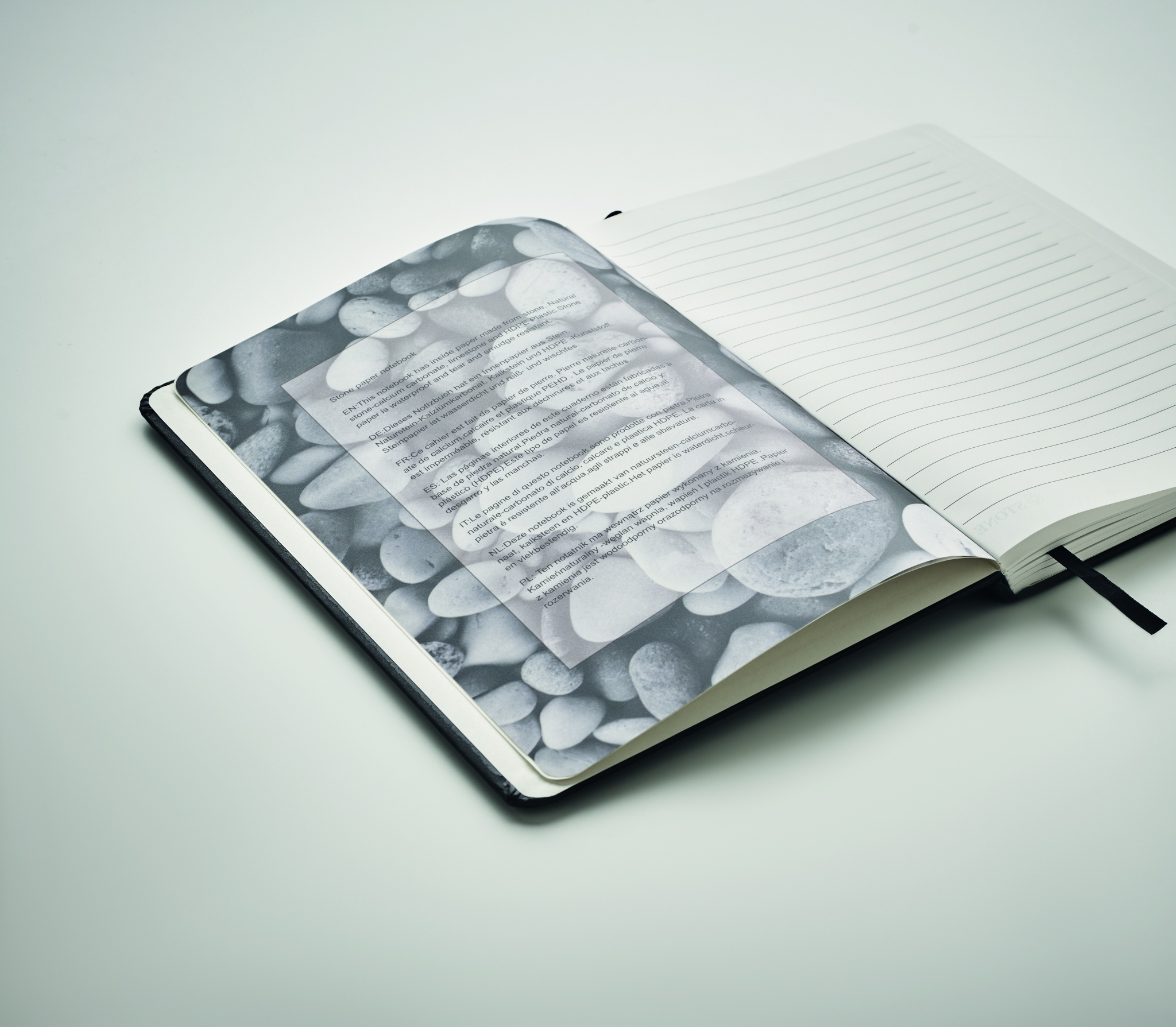 A5 märkmik kõva taaskasutatud pappkaanega. Casebound. 160 kivipaberiga vooderdatud lehte (80 lehte). Elastne sulgemisrihm ja lint-lehemarker.