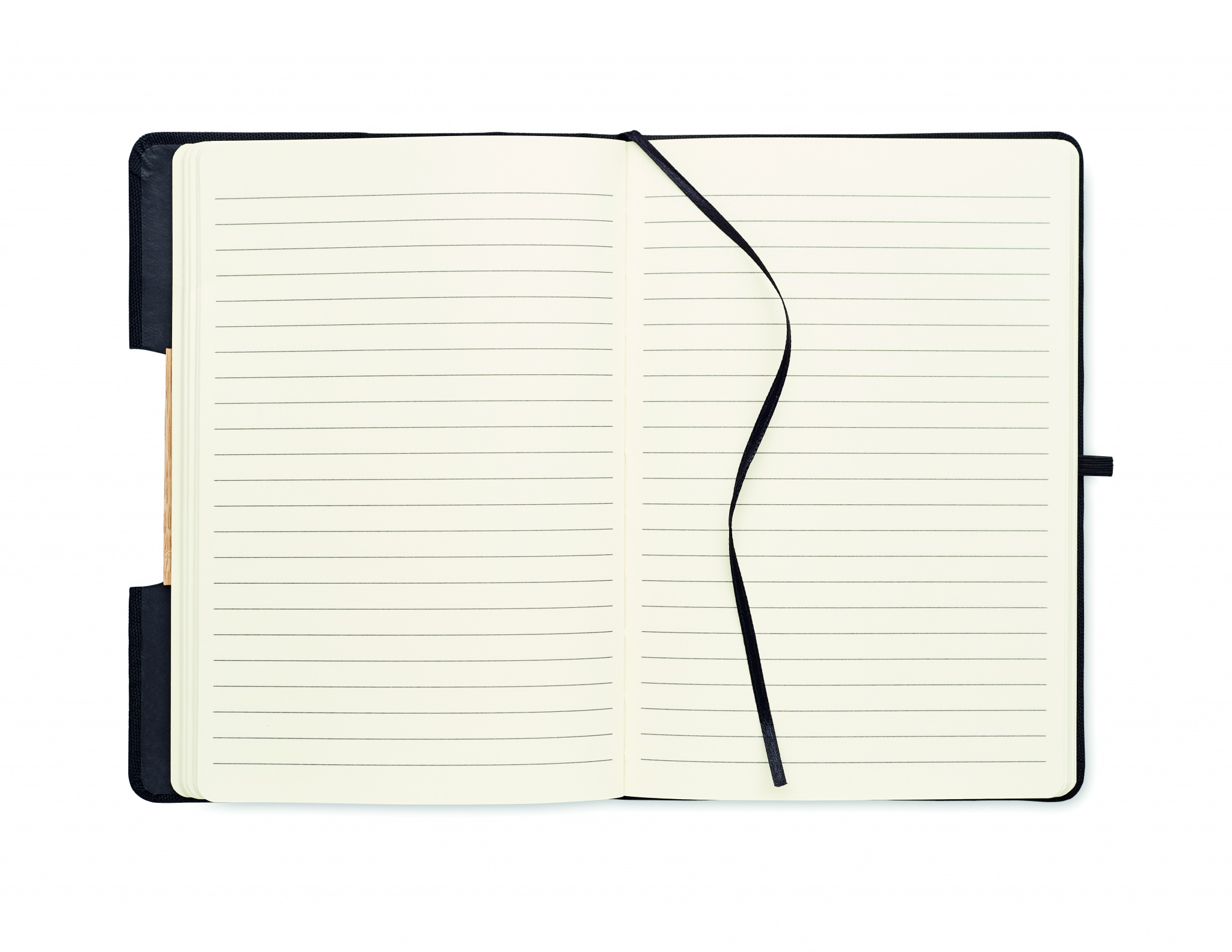 A5 sülearvuti 600D RPET kõvakaanega, bambusdetailidega nutitelefoni aluse funktsiooniga. Casebound. 160 joonelist lehte (80 lehte). 70 gsm taaskasutatud paber. Sobiv elastne sulgemisrihm, lindiga lehemarker ja pliiatsihoidja. Bambus on looduslik toode, ühe eseme värvis ja suuruses võib esineda väikesi erinevusi, mis võivad mõjutada lõppviimistlust.