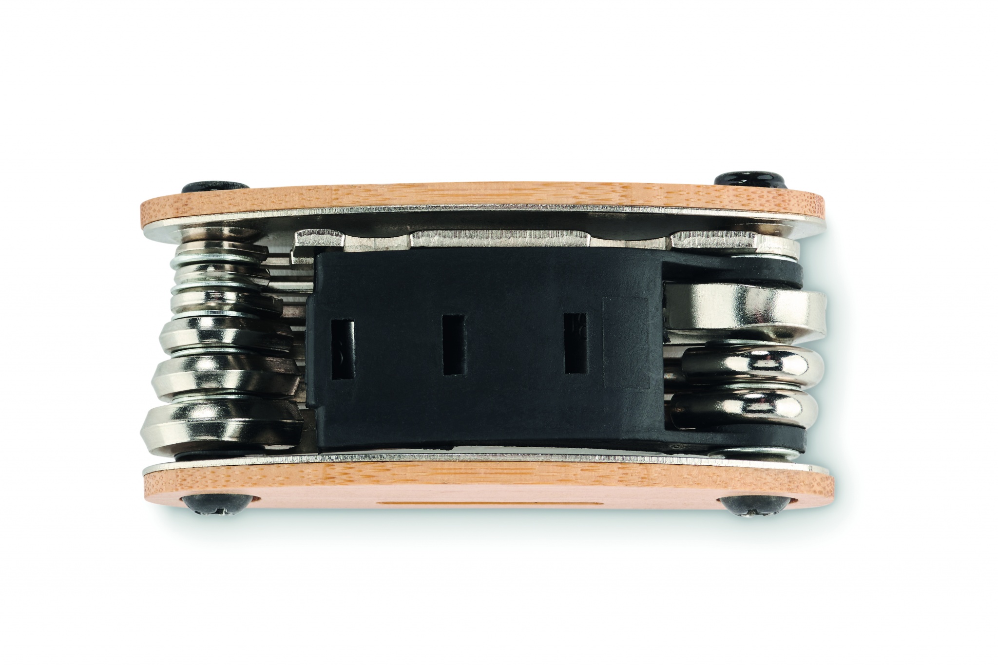 Roostevabast terasest mitmeotstarbeline bambuskattega taskutööriist. 11 funktsiooni. See sisaldab: kuuskantvõtmeid, lamevõtit, varrukapikendust, Phillipsi kruvikeerajat ja mutrivõtit.