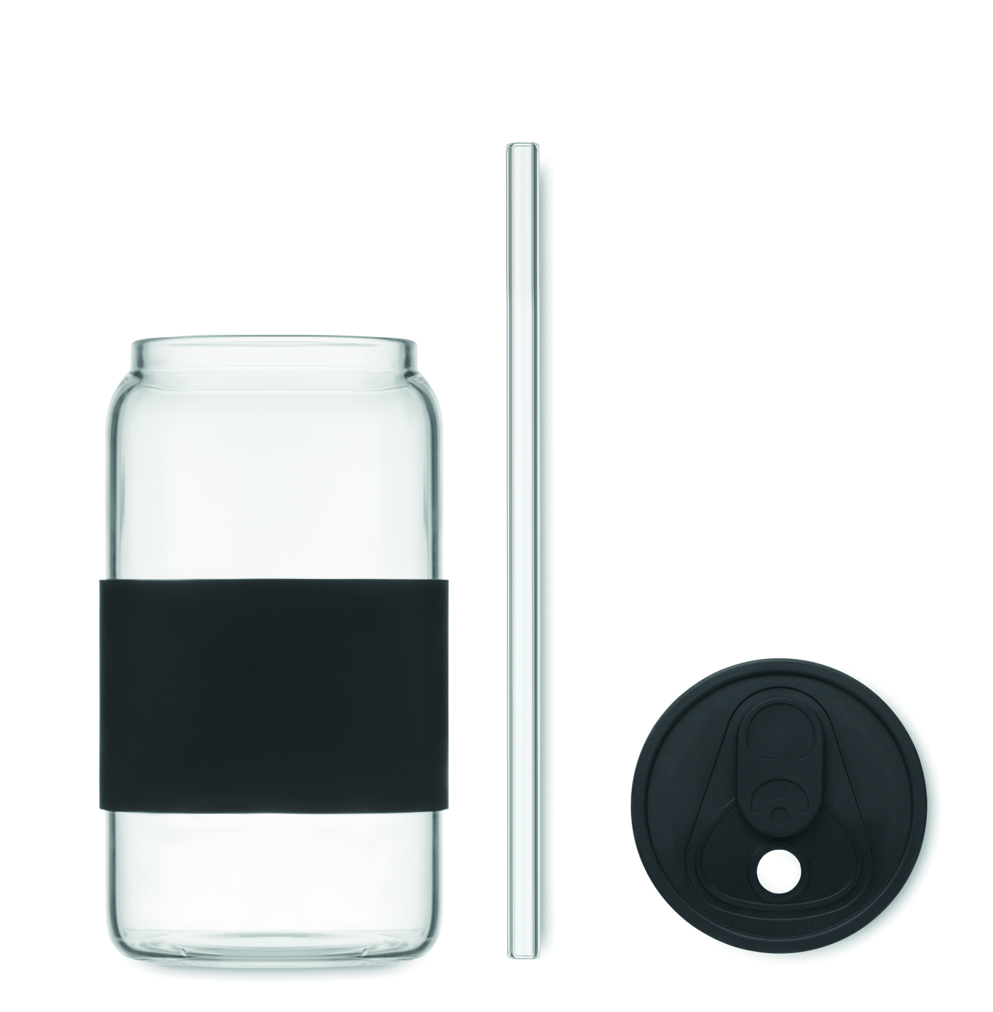 Must kõrgborosilikaatklaasist joogitops silikoonkaane ja käepidemega. Borosilikaatklaasist joogikõrs. Mahutavus: 550 ml.
