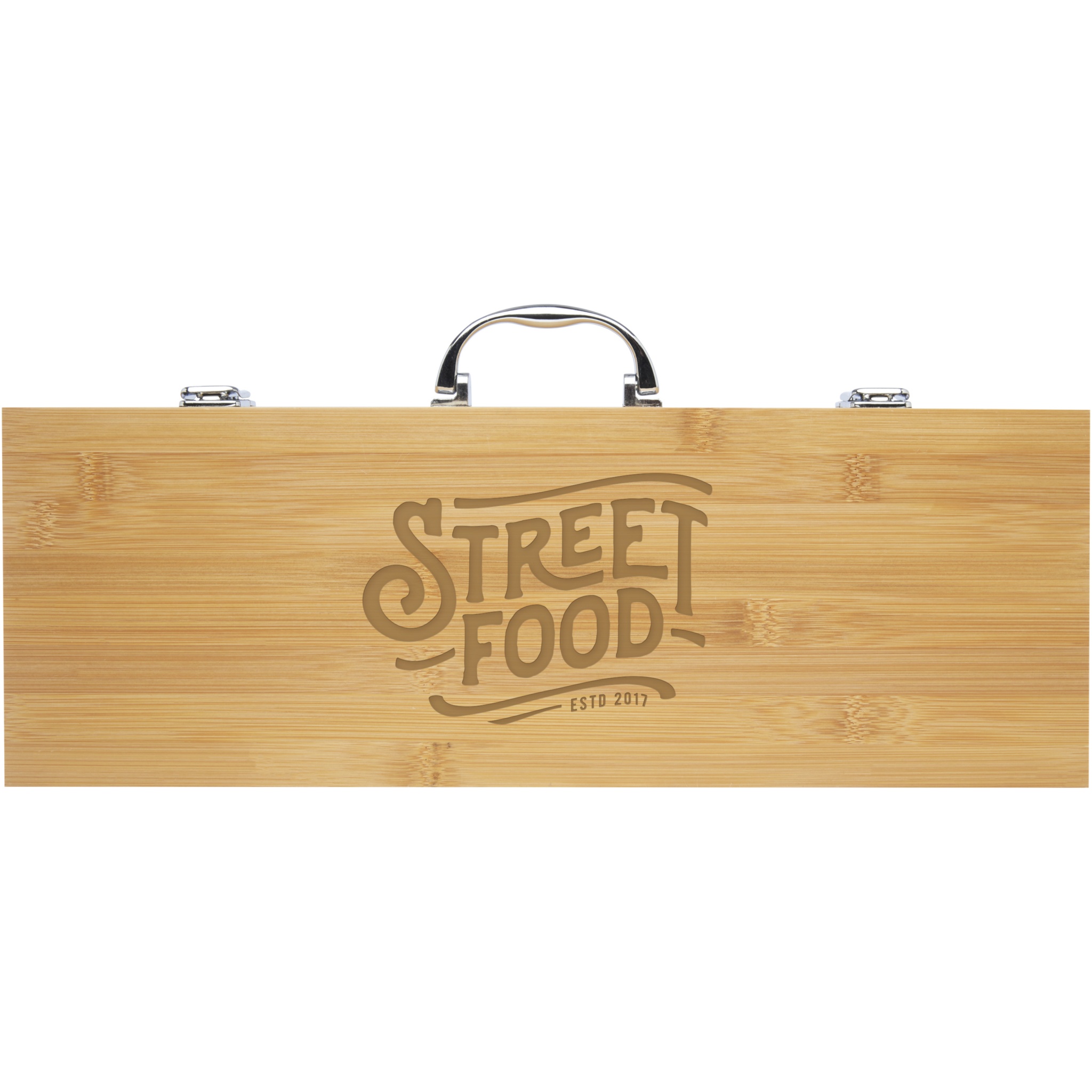 Bambusest 5-osaline grillikomplekt labida (40 x 9,5 cm), tangi (34,5 x 6 cm), kahvli (38,5 x 3 cm), noa (38,5 x 3 cm) ja harjaga (38 x 4,3 cm). Komplekt tarnitakse bambusest kinkekarbis (46 x 16,2 x 7,4 cm). Käepidemed ja kinkekarp on valmistatud bambusest, mis on hangitud ja toodetud säästvaid standardeid järgides.