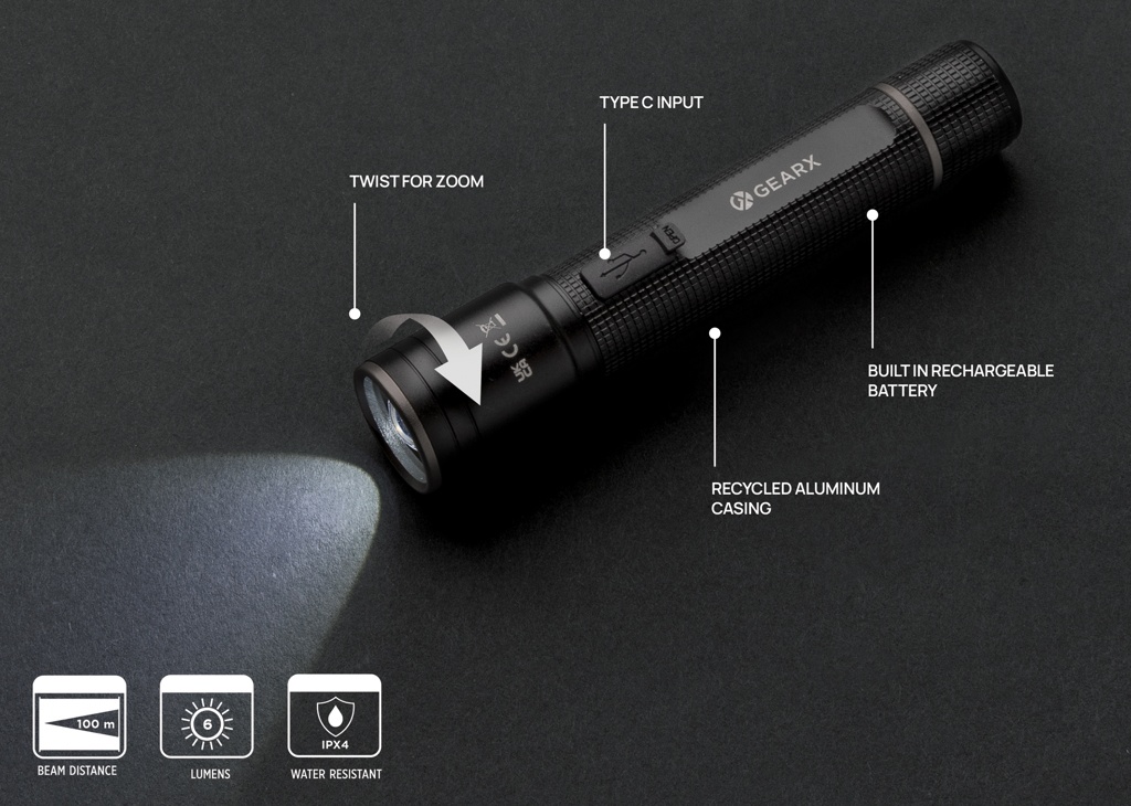 Logo trade ärikingitused foto: Gear X RCS taaskasutatud alumiiniumist USB-taaslaetav taskulamp