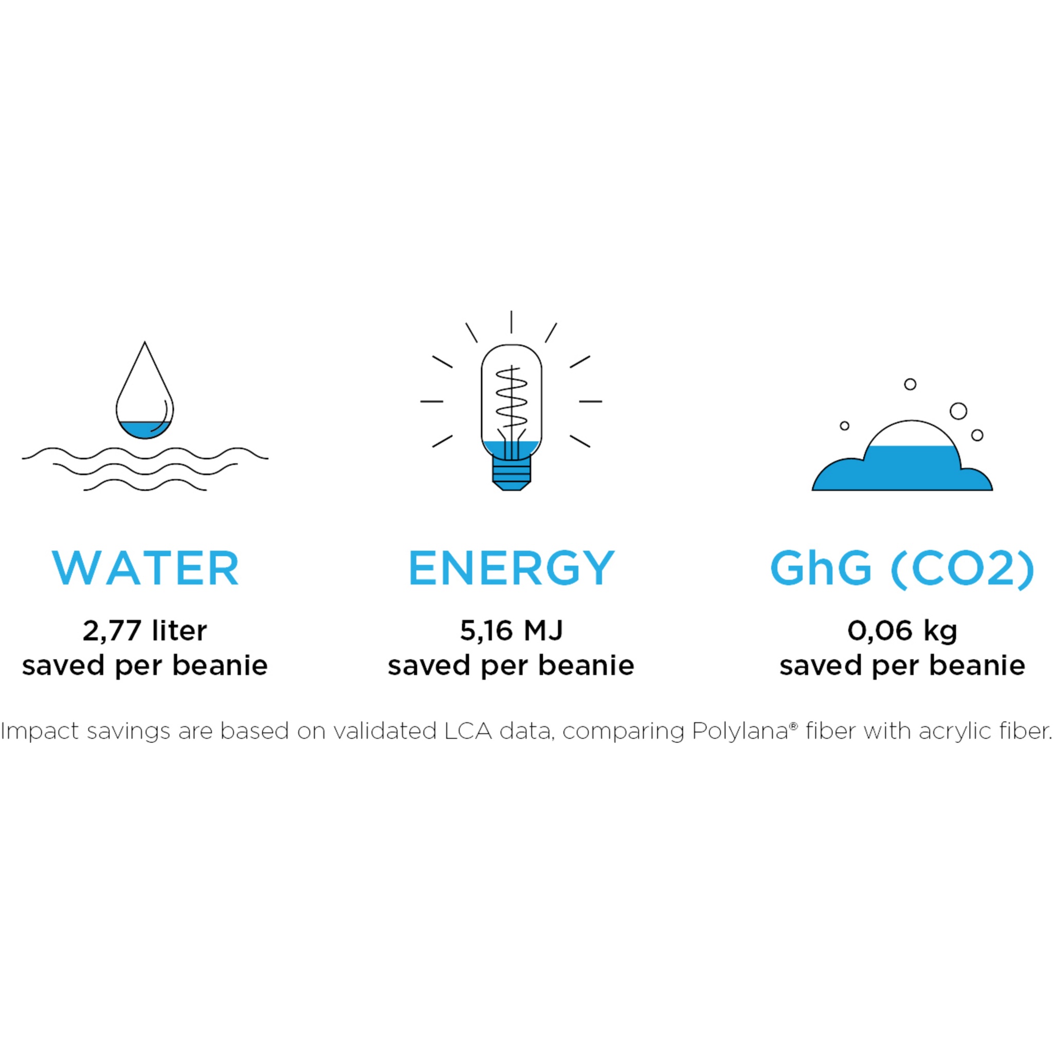 Võrreldes akrüülkiuga, on iga Hale mütsi puhul saavutatud järgmine kokkuhoid: 2,77 liitrit vett, 5,16 MJ energiat ja 0,06 kg GhG (CO2). Mõju kokkuhoid põhineb kinnitatud olelustsükli hindamise (LCA) andmetel. Valmistatud 1x1 soonikkoes Polylana® kiust ja akrüülist 12-m tihedusega. Ideaalne valik neile, kes hindavad moodi, hoolitsedes samas keskkonna eest.