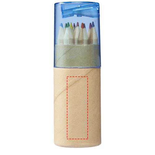 12 värvilist pliiatsit papp-silindriga karbis koos teritajaga plastkaanes. Dekoratsioon pole komponentidel saadaval.