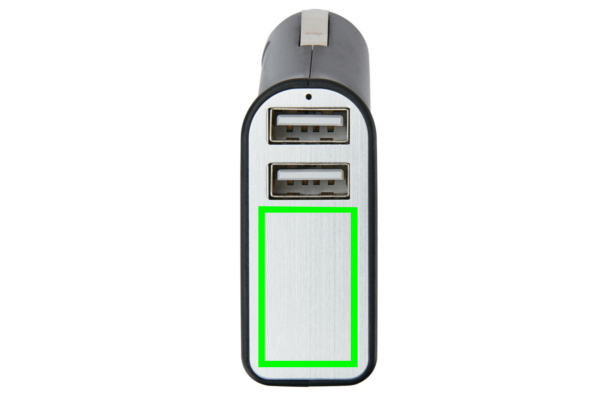 Logo trade reklaamtoote pilt: Kahe pordiga autolaadija koos rihmlõikuri ja haamriga
