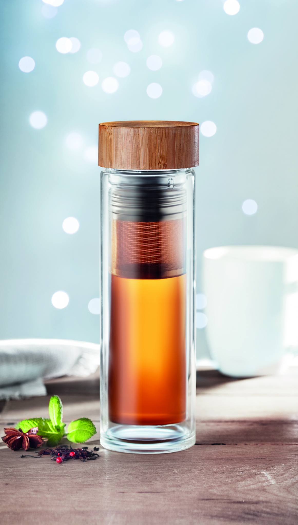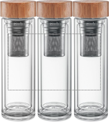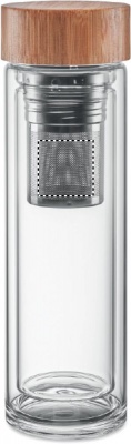Topeltsein kõrge boorsilikaatklaasist pudelis ja bambusest kaas koos teetõmmisega. Mahutavus: 400 ml. Bambus on looduslik toode, ühe eseme värvis ja suuruses võib esineda väikesi erinevusi, mis võivad mõjutada lõppviimistlust. Lekkevaba. Boorsilikaatklaasile ei ole lasergraveerimine võimalik.