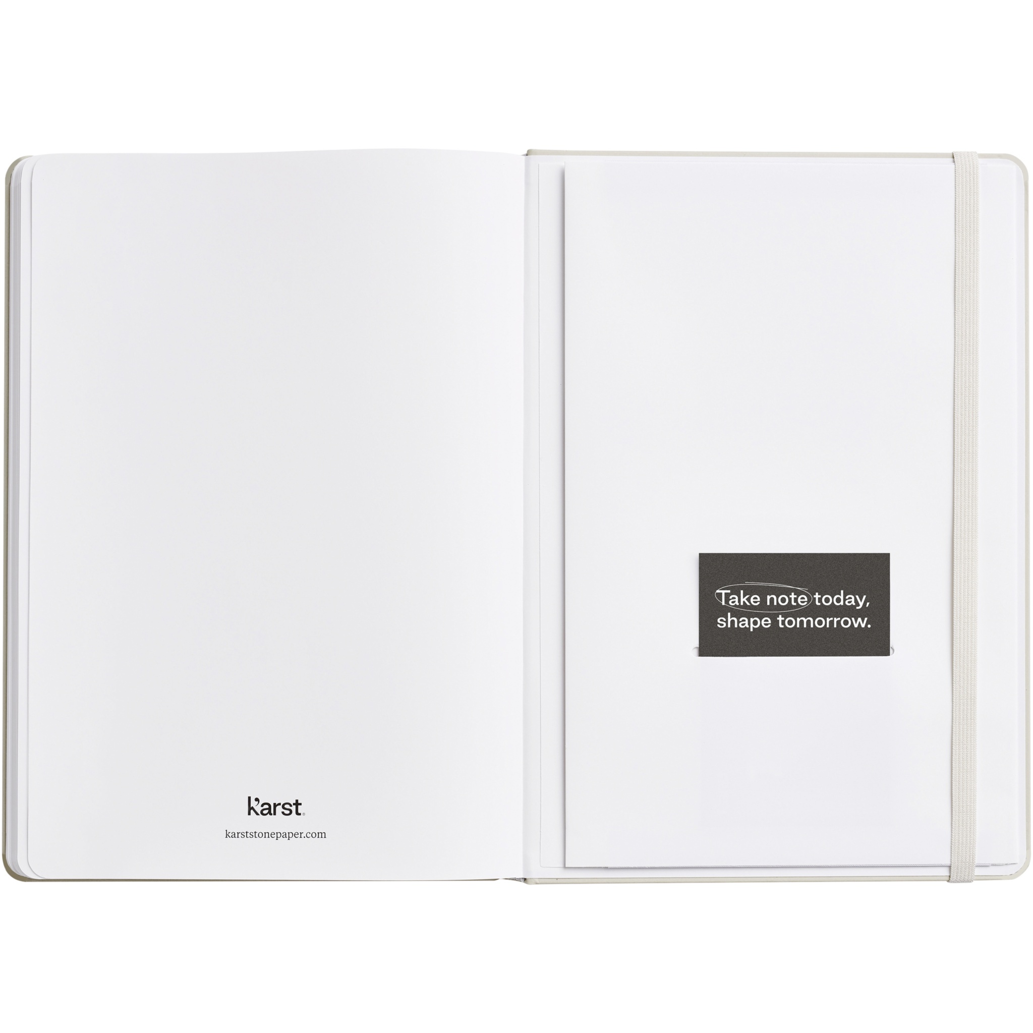 Karst® A5 kõvakaaneline sülearvuti on enimmüüdud ja meelitab publikut. Lehtede sile tekstuur ja tasapinnaline köide pakuvad märkmete ja ideede jaoks piisavalt mugavust ja kirjutamisruumi. Sisaldab elastset riba, mis hoiab sülearvuti suletuna, 144 veekindlat, rebenemiskindlat vooderdatud lehte, laiendatavat tagatasku hoidmiseks ning eralduspaela, millel on kuumtihendatud ots ja ümarad nurgad.