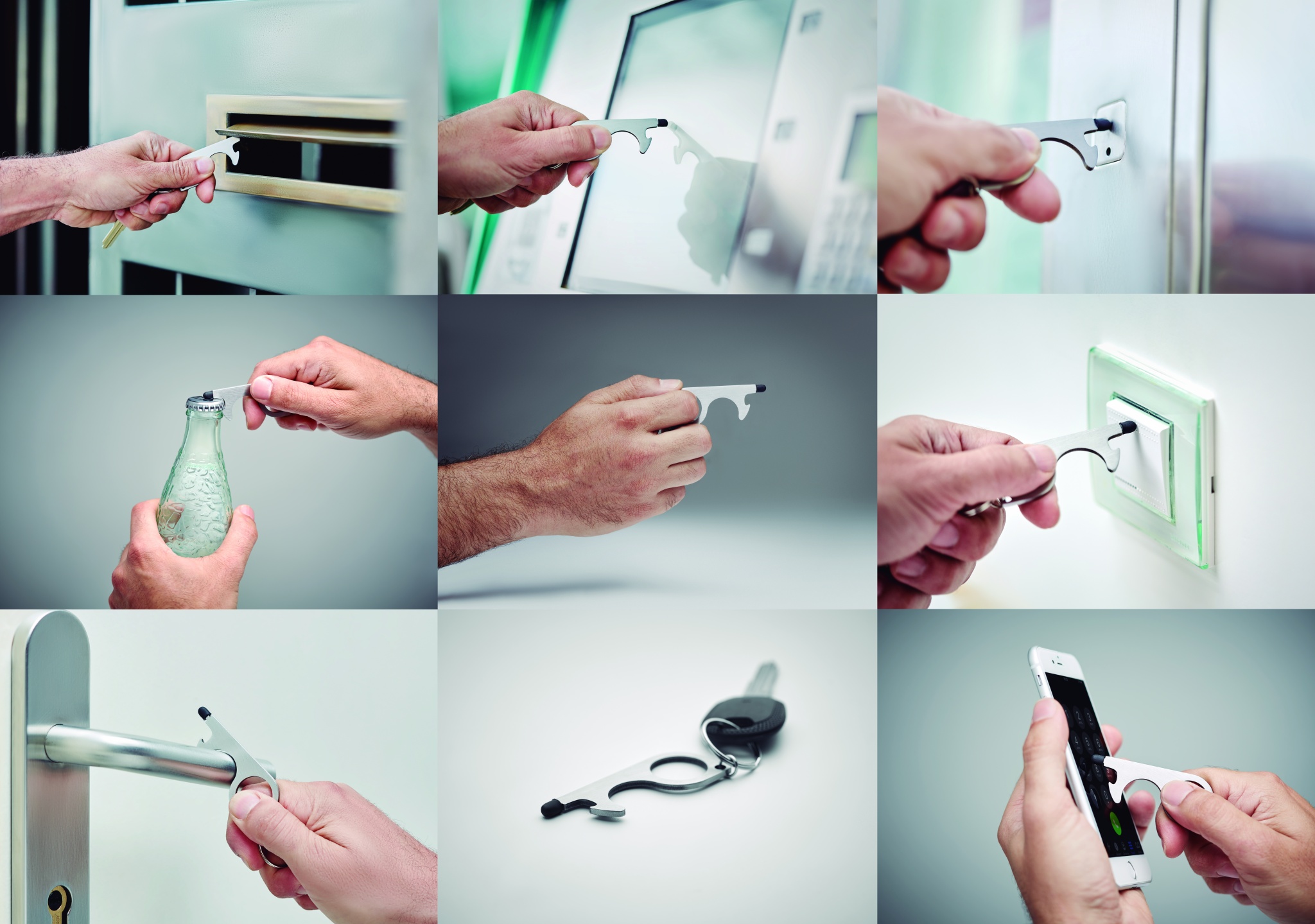 Multifunktsionaalne viis-ühes puutevaba võtmehoidja. Avage uksed, vajutage liftide, fooride, sularahaautomaatide ja mobiilseadmete nuppe neid puudutamata. Kaasas pudeliavaja, pliiats ja võtmehoidja. Lihtne viis mikroobide leviku tõkestamiseks.
