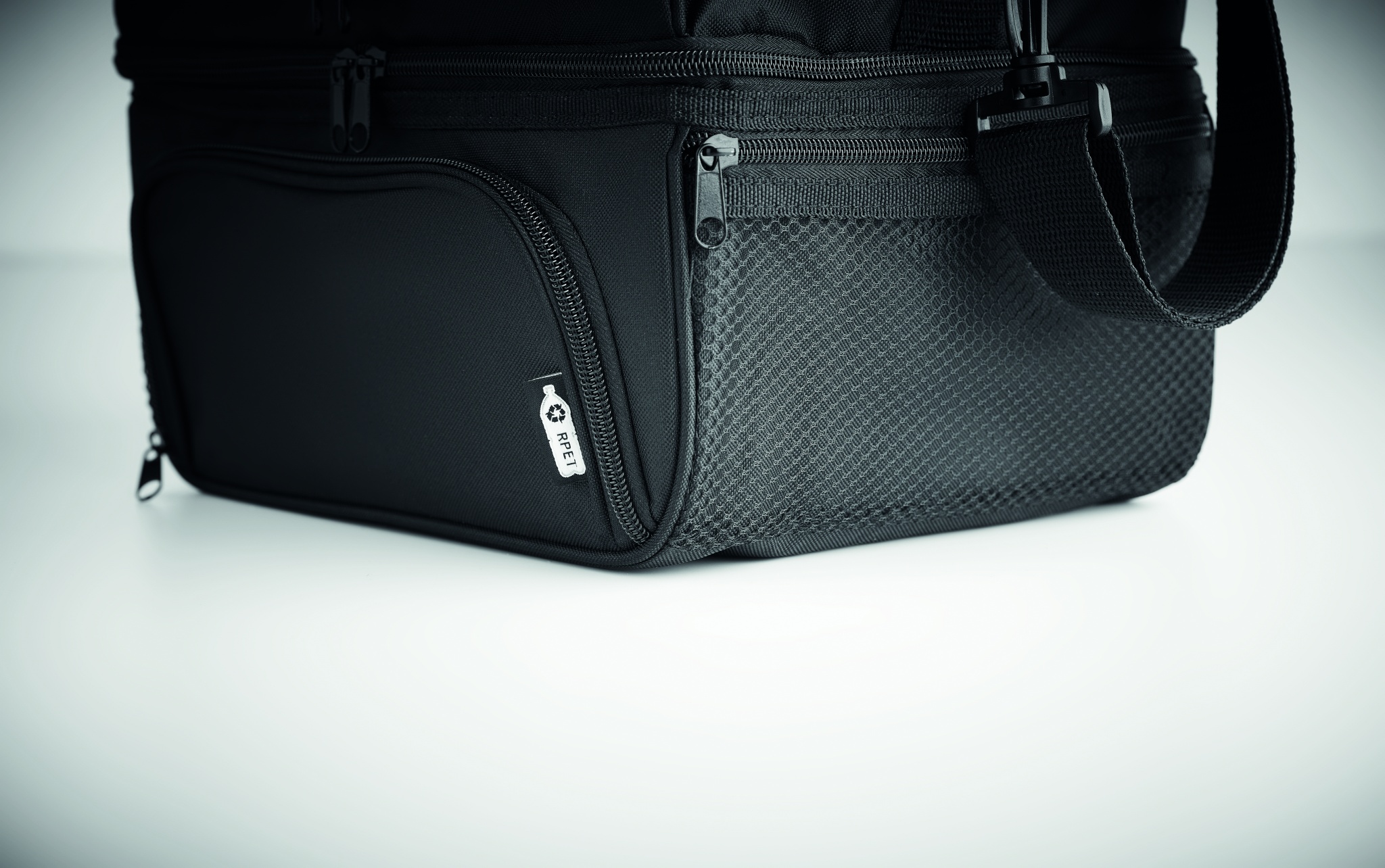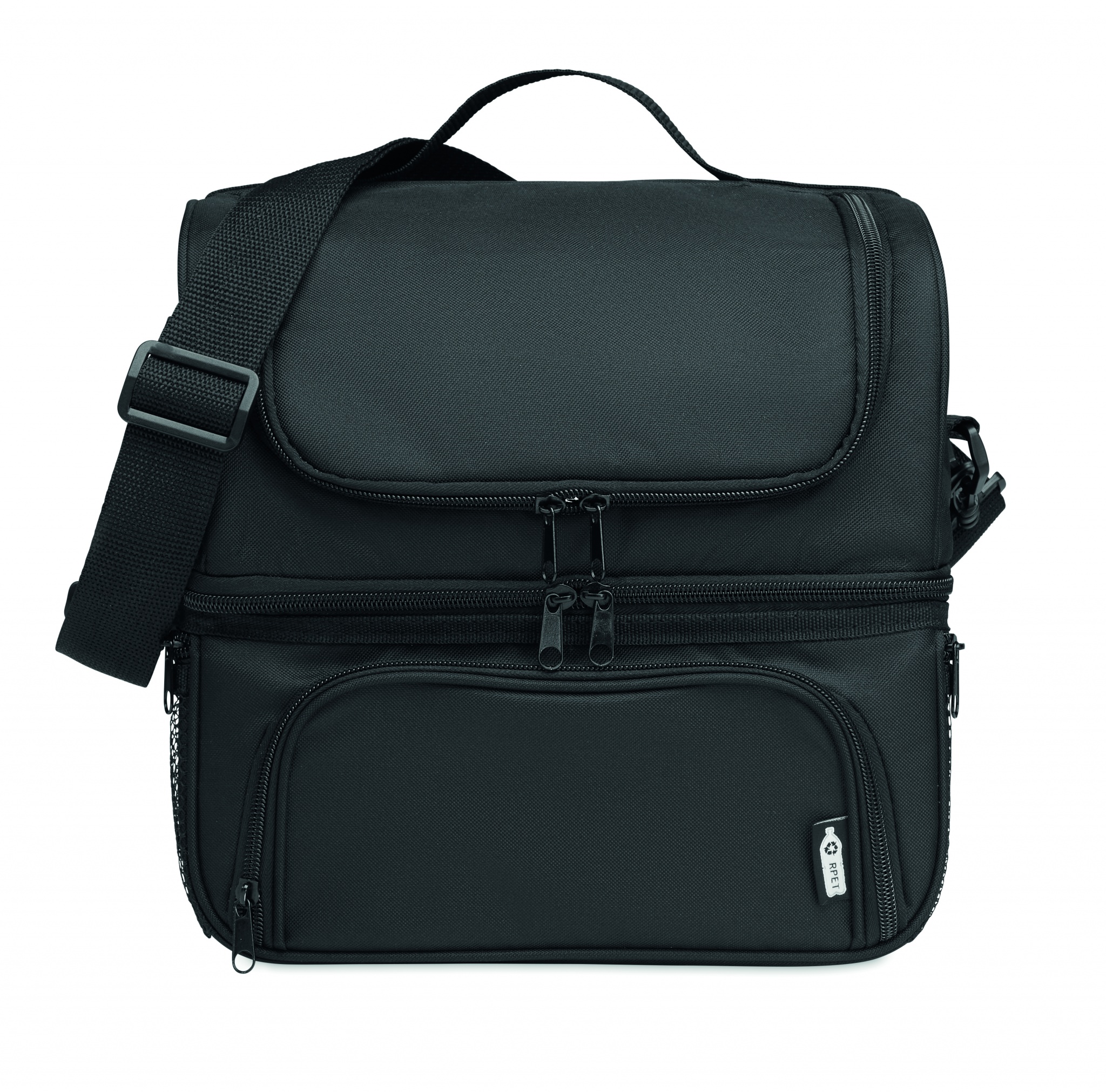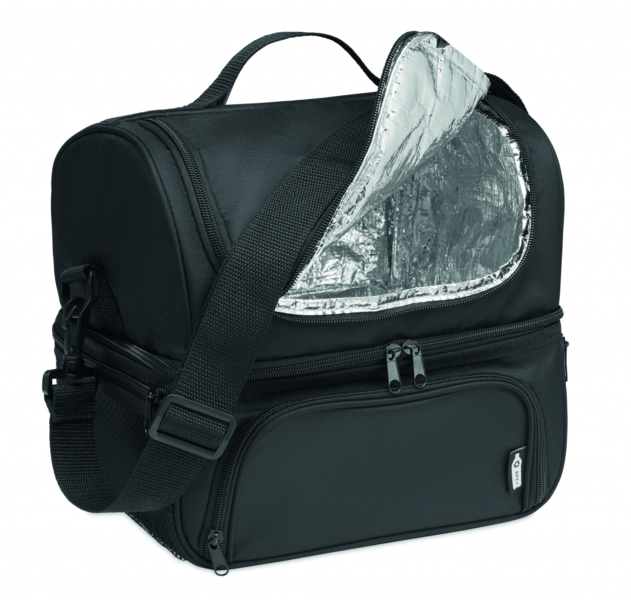 Isoleeritud jahutuskott 600D RPET-ist sisaldab korduvkasutatavat PP 1900 ml lõunakarpi. 2 sektsiooniga kuuma ja külma toidu eraldi hoidmiseks. Reguleeritav ja eemaldatav õlarihm. 2mm alumiiniumfooliumist vooder.