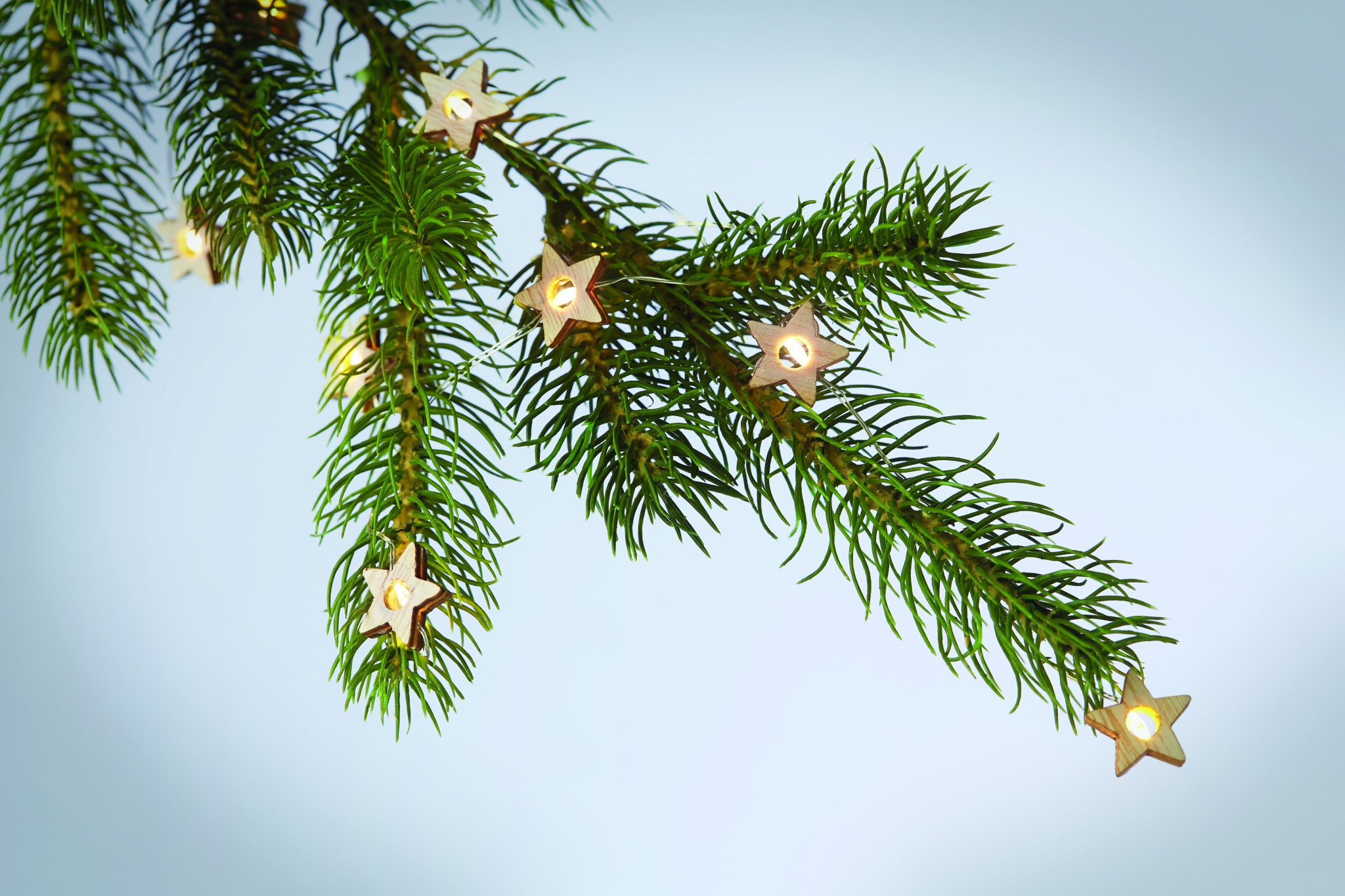 20 puidust tähekujulise LED-tulega nöör. Esitatakse pappkarbis. 2 AA patareid ei kuulu komplekti. Sisse/välja nupp patareikorpuses.