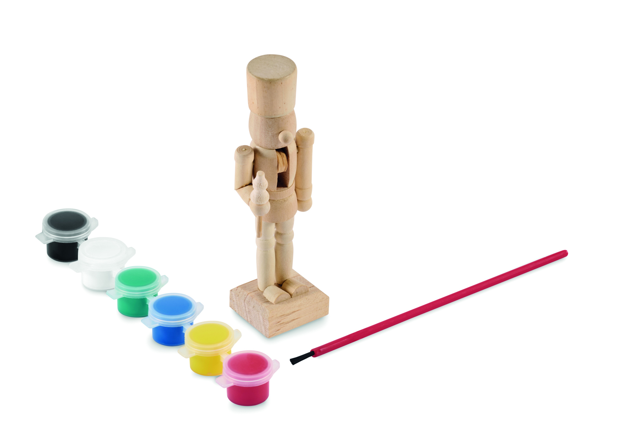 Puidust maalikomplekt pähklipureja tegelaskujuga, 6 veepõhise pigmendi ja 1 pintsliga.
