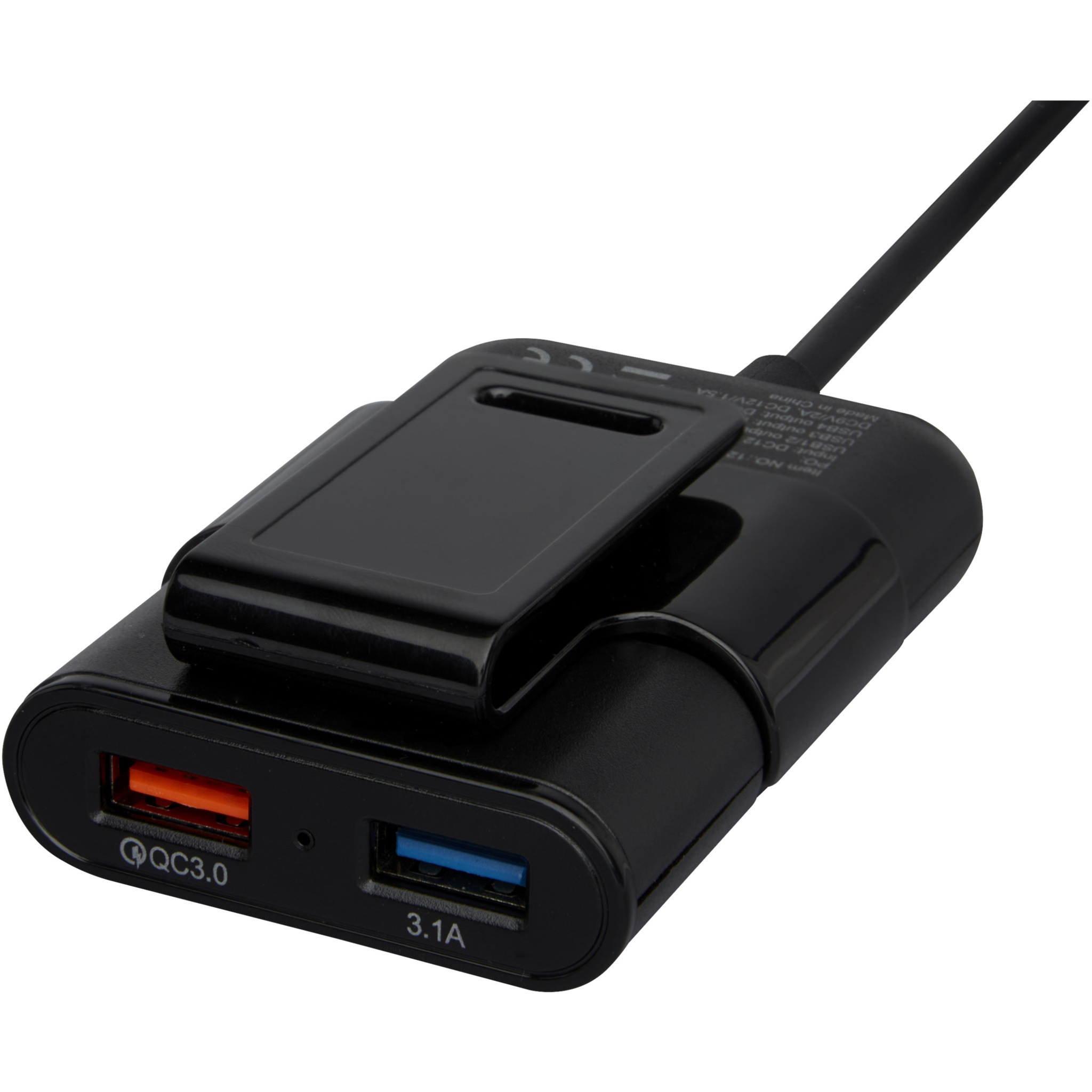 See pere- ja reisimiseks mõeldud laadija võimaldab taga- ja esiistmel sõitjatel oma elektroonikaseadmeid teel olles samaaegselt laadida. Universaalne ühilduvus 12/24V sõidukitele. Qualcomm Quick Charge Protocol 3.0. USB1/2 väljund: DC5V/2.4A, USB3 väljund: DC5V/3.1A, USB4 väljund: DC5V/3A, DC9V/2A, DC12V/1.5A. Kaabli pikkus: 170 cm.