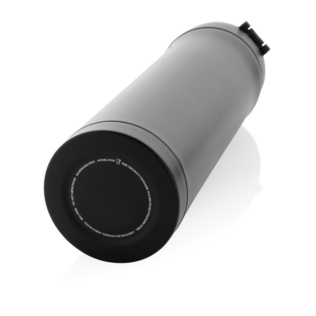 See suurepärane kahekordse seinaga roostevabast terasest vaakumkolb hoiab teie joogi soojana kuni 5 tundi või jahedana kuni 15 tundi. Kaas on lukustatav ja väldib seega lekkimis- või mahavalgumisohtu. Kaant on optimaalse hügieeni tagamiseks lihtne puhtana hoida ja see on nõudepesumasinas pestav. Kolvi ainulaadne disain võimaldab mugavalt ja ohutult juua ühe käega otse kolvist. Kolbi suurus sobib paigutamiseks igasse autojoogihoidjasse. Valmistatud RCS (Recycled Claim Standard) sertifitseeritud taaskasutatud materjalidest. RCS-sertifikaat tagab taaskasutatud materjalide täielikult sertifitseeritud tarneahela. Taaskasutatud kogusisaldus: 76% eseme kogukaalust. BPA vaba. Mahutavus 450 ml. Kaasa arvatud FSC®-sertifikaadiga kraftpakendid.