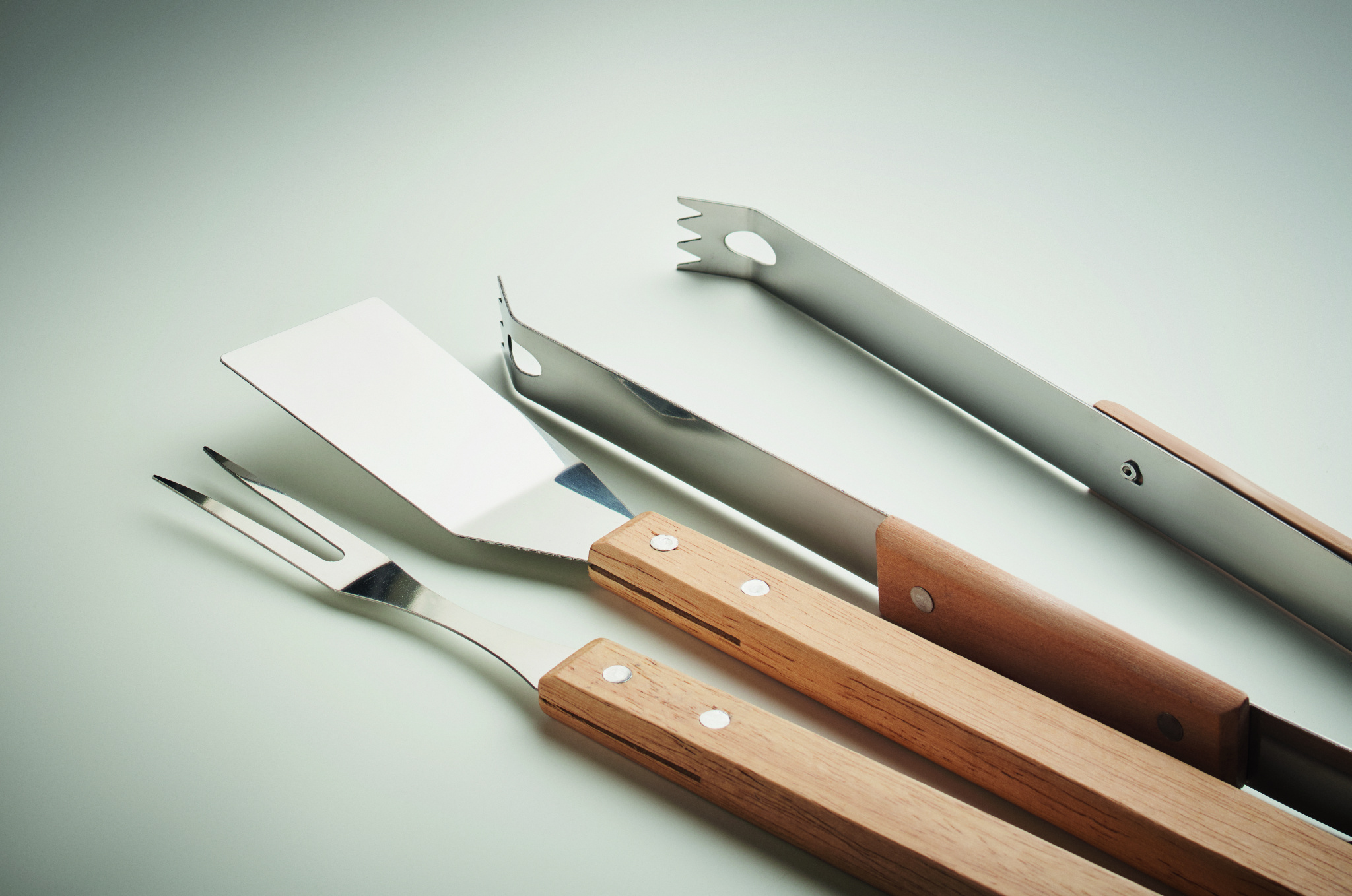 Komplektis 3 roostevabast terasest grillitööriista: labidas, kahvel ja tammepuu käepidemega klamber. Pappkarbis.