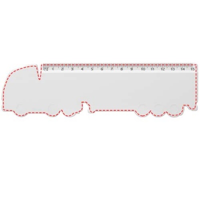 Veoautokujuline taaskasutatud plastist joonlaud, mille märgistused on saadaval tollides või sentimeetrites.