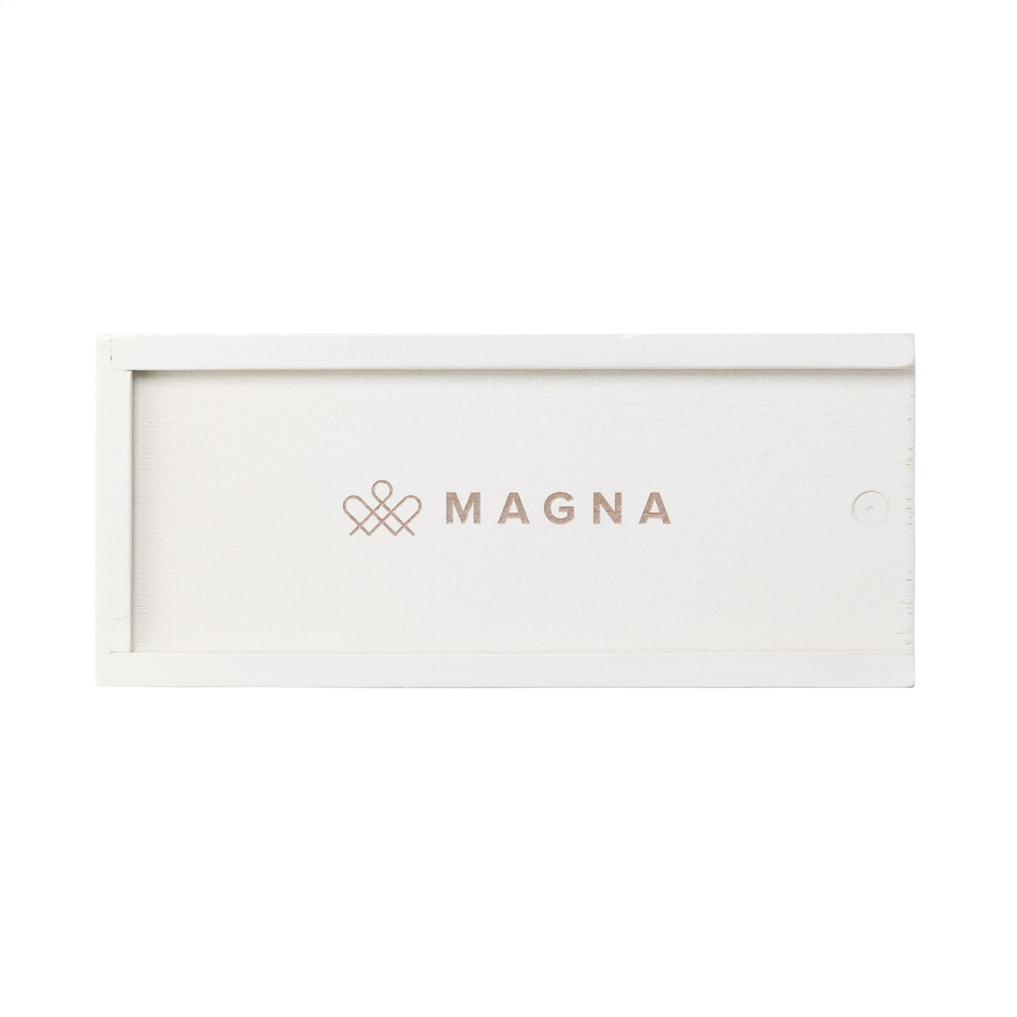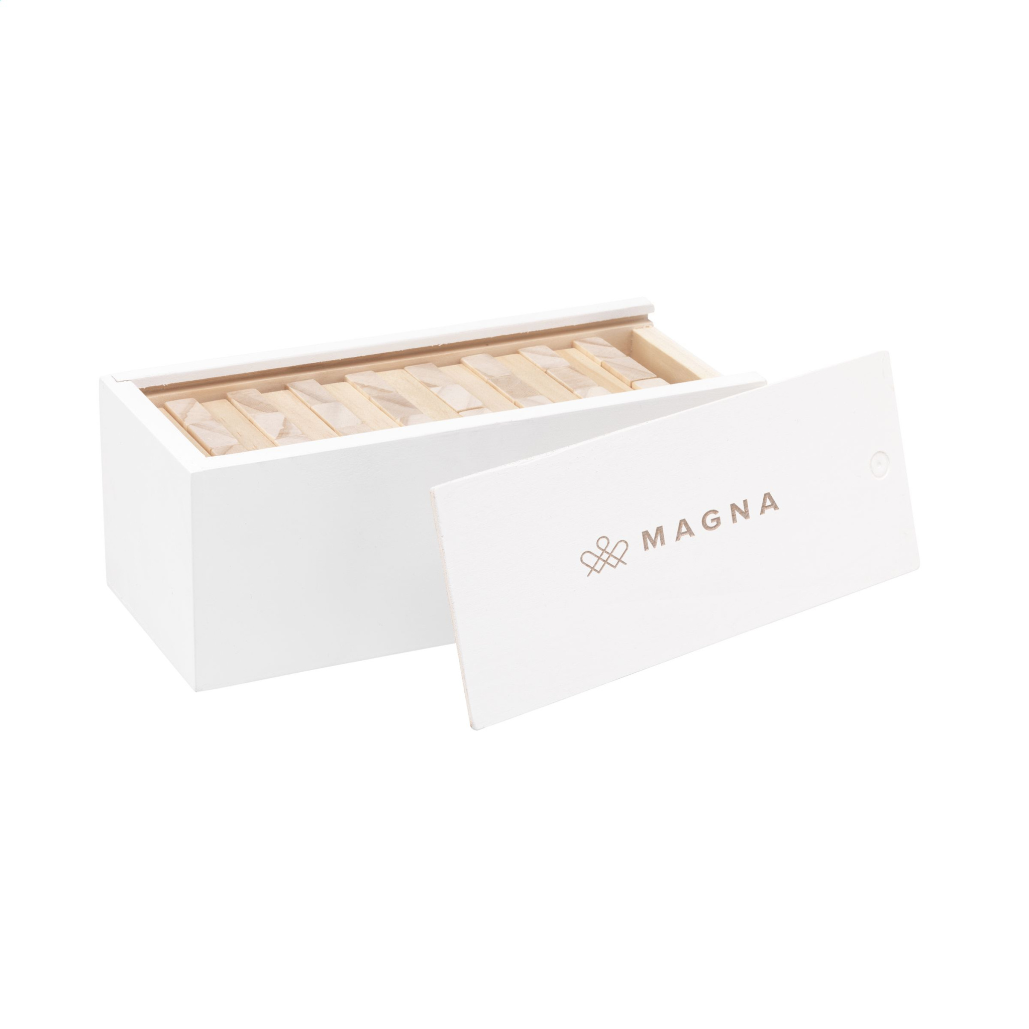 Puidust virnastamismäng (48 klotsi). Torni mõõdud 16,5 x 6 x 6 cm. Kaasas valge puidust kast, millel on libistatav ava, mis hõlbustab ladustamist. Sealhulgas juhiseid. Iga toode tarnitakse eraldi pruunis pappkarbis.