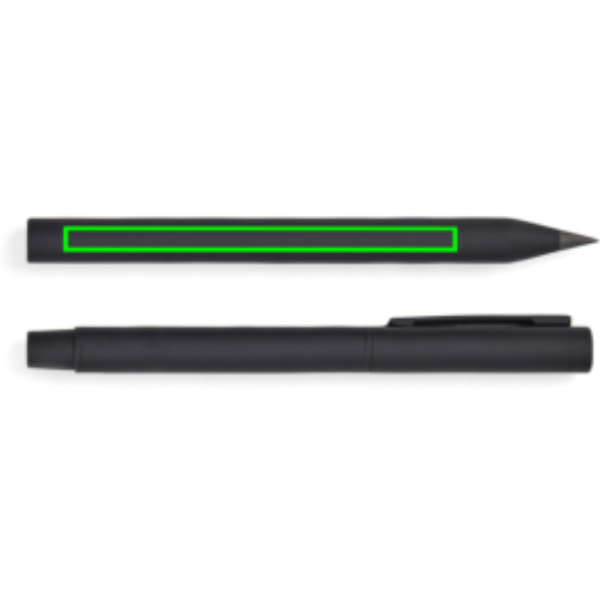 See moodne ja elegantne komplekt sisaldab kahte pastapliiatsit: igavese pliiatsit ja klassikalist korgi ja klambriga pastapliiatsit. Need pliiatsid, mis on loodud nii stiilseks kui ka funktsionaalsuseks, on valmistatud RCS-sertifikaadiga taaskasutatud roostevabast terasest, millel on mugava haarde ja matt viimistlusega kummist pinnakate. Mõlemal pliiatsil on tasakaalustatud kaal, mis tagab stabiilsuse ja pingutuseta kirjutamise. Igavene pliiats pakub piiramatut kirjutamist. Pastapliiatsil on peen 1,00 mm ots ning see tagab sujuva ja ühtlase kirjutamise dokumentaalselt sinise tindiga, mis kestab kuni 1200 meetrit. RCS-i (Recycled Claim Standard) sertifitseeritud RCS-sertifikaat tagab, et kogu taaskasutatud materjalide tarneahel on sertifitseeritud. Taaskasutatud kogusisaldus põhineb toote kogumassil. See toode sisaldab 52% RCS-sertifikaadiga taaskasutatud alumiiniumi ja 10% RCS-sertifikaadiga roostevaba terast.