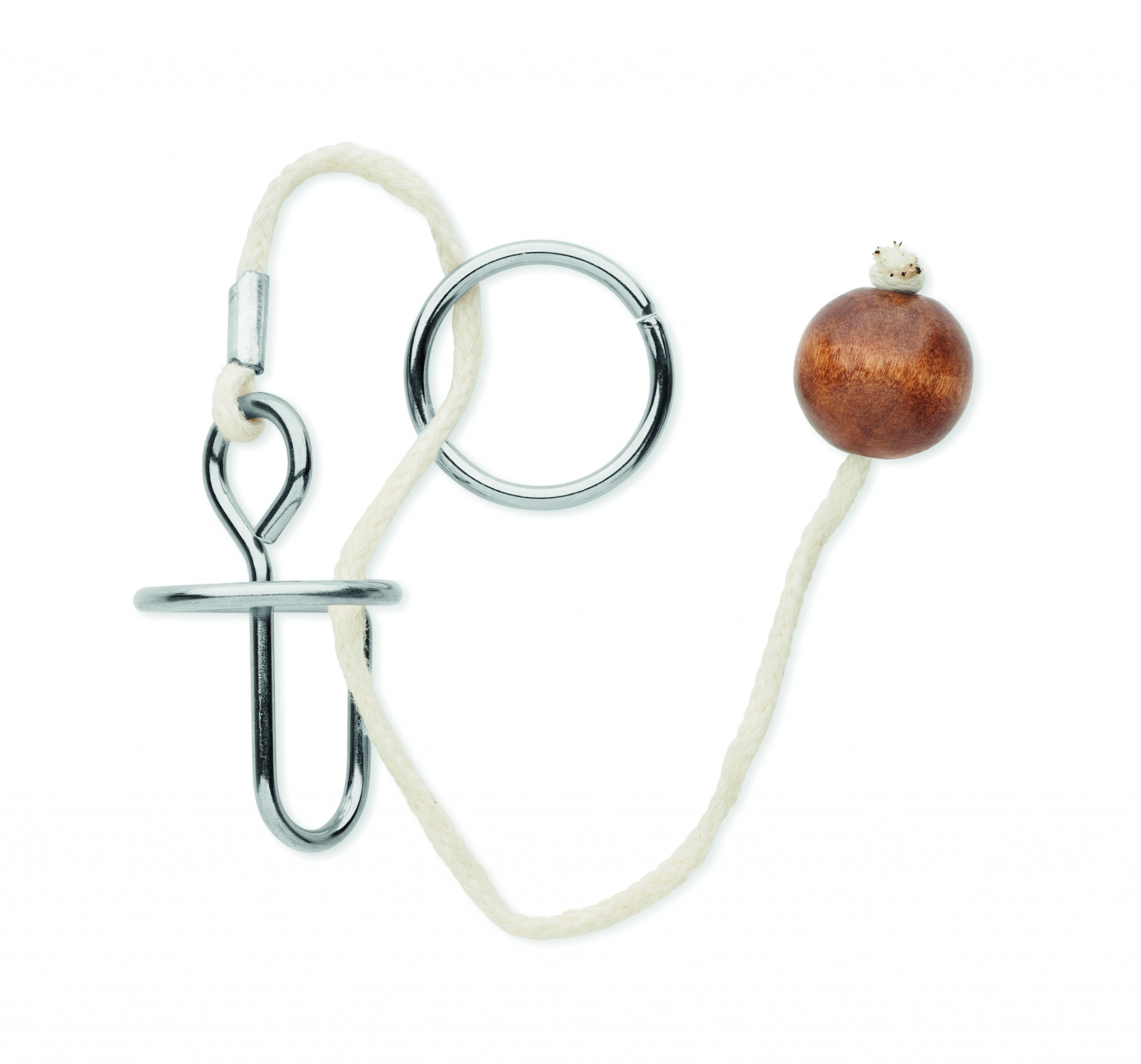 Metallista, puusta ja puuvillanyöristä koostuva pulmapelisetti: 2 ja 4 kappaletta. Toimitetaan kierrätyspaperirasiassa.