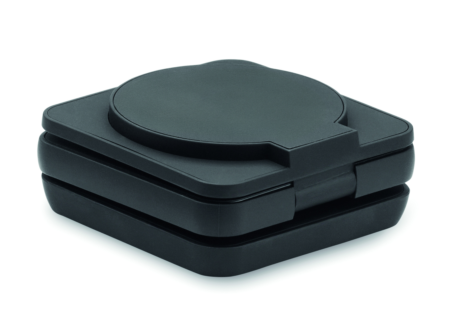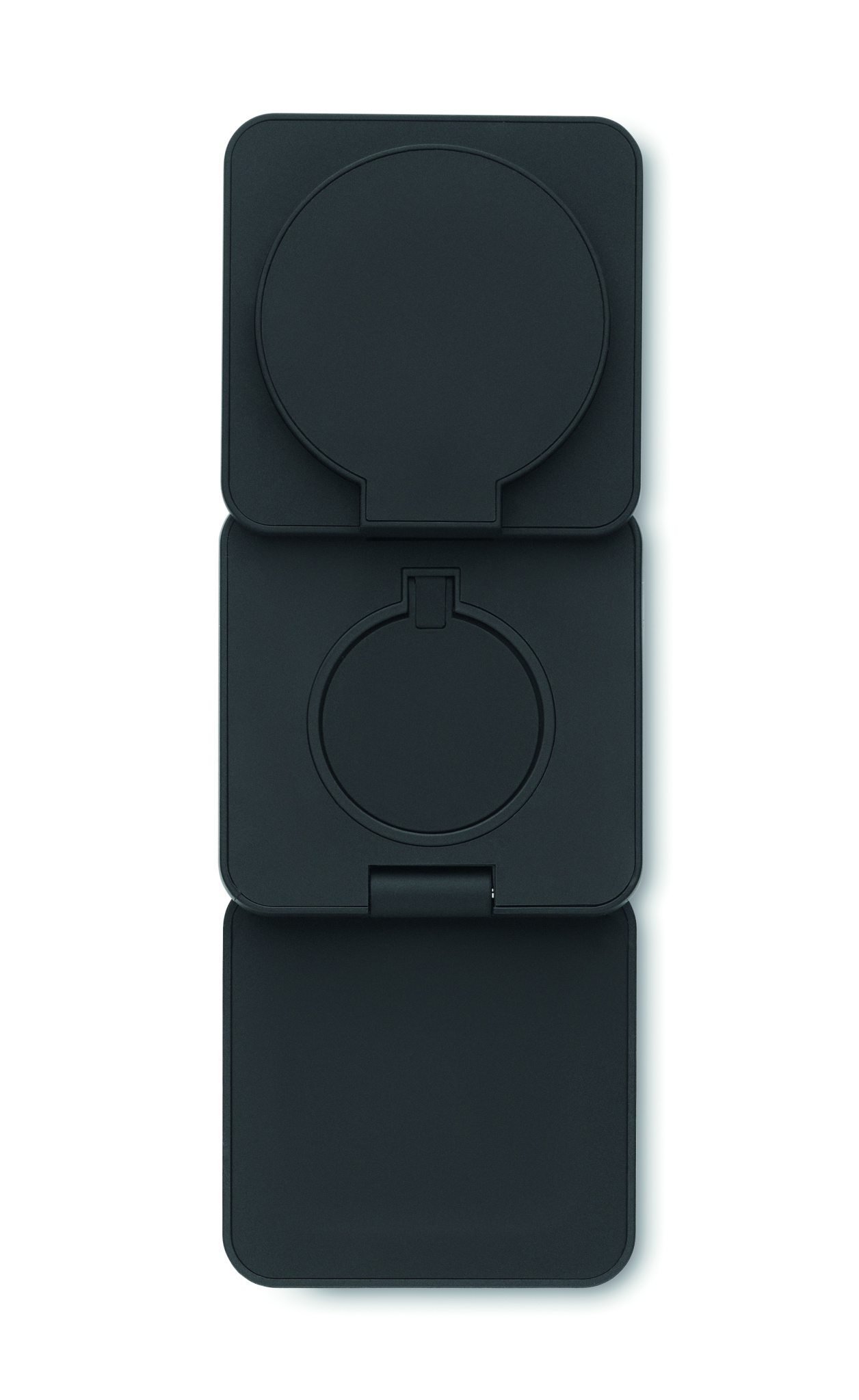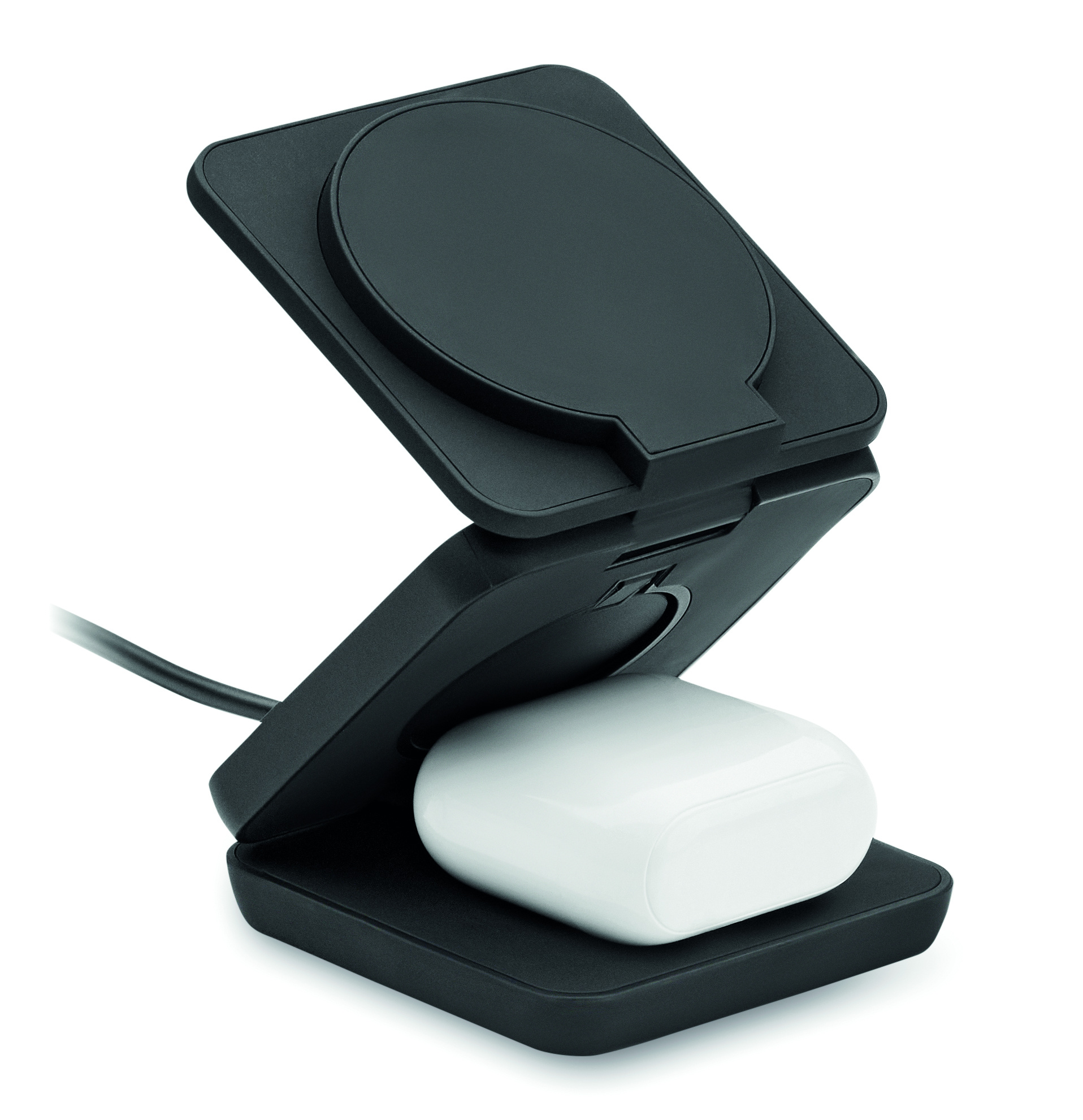 3 in 1 -taitettava latausasema kumitettua kierrätettyä ABS-muovia. Se sisältää magneettisen langattoman laturin 15 W, älykellon laturin (vain Apple®) ja TWS-laturin.