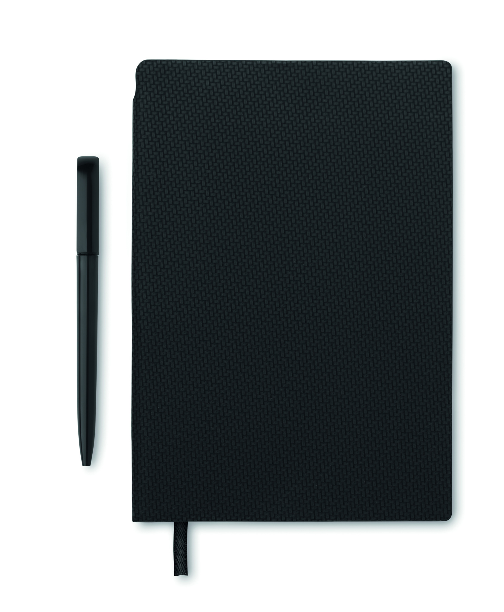 A5-kokoinen muistikirja strukturoidulla PU-kuorella ja ABS-kierrepallokynä selkä-kynäpidikkeen sisällä. Asia sidottu. 160 rivillistä sivua kierrätyspaperia (80 arkkia).