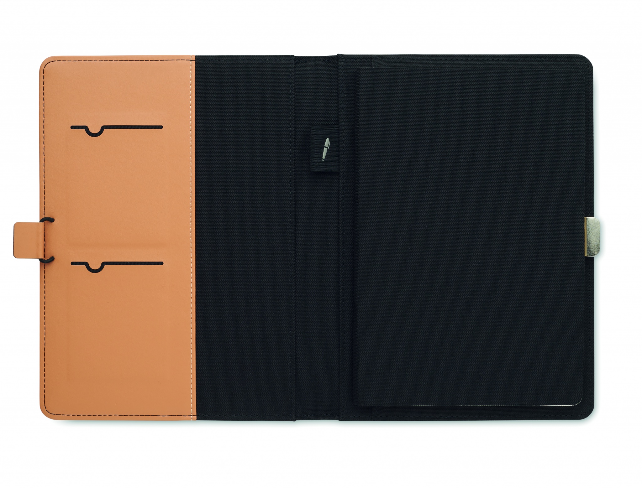 A5-salkku RPET-materiaalista, keinonahkaisilla yksityiskohdilla. A5-muistikirja, jossa on kovakorkkikansi. 128 viivoitettua sivua kierrätyspaperista (64 arkkia). Kynänpidike. 2 korttipidikettä ja yksi iso lokero. Joustava sulkuhihna, jossa metalliset yksityiskohdat.