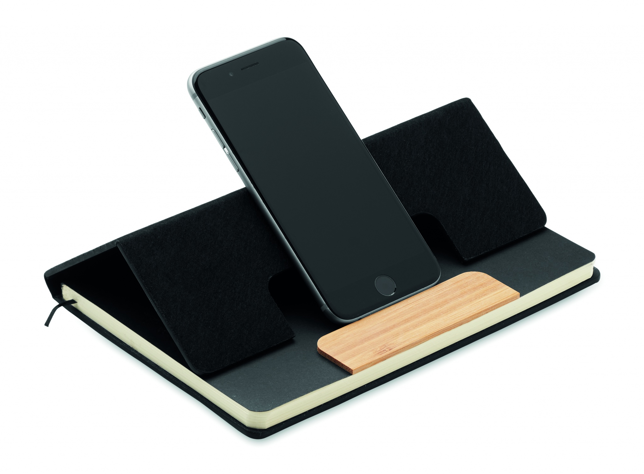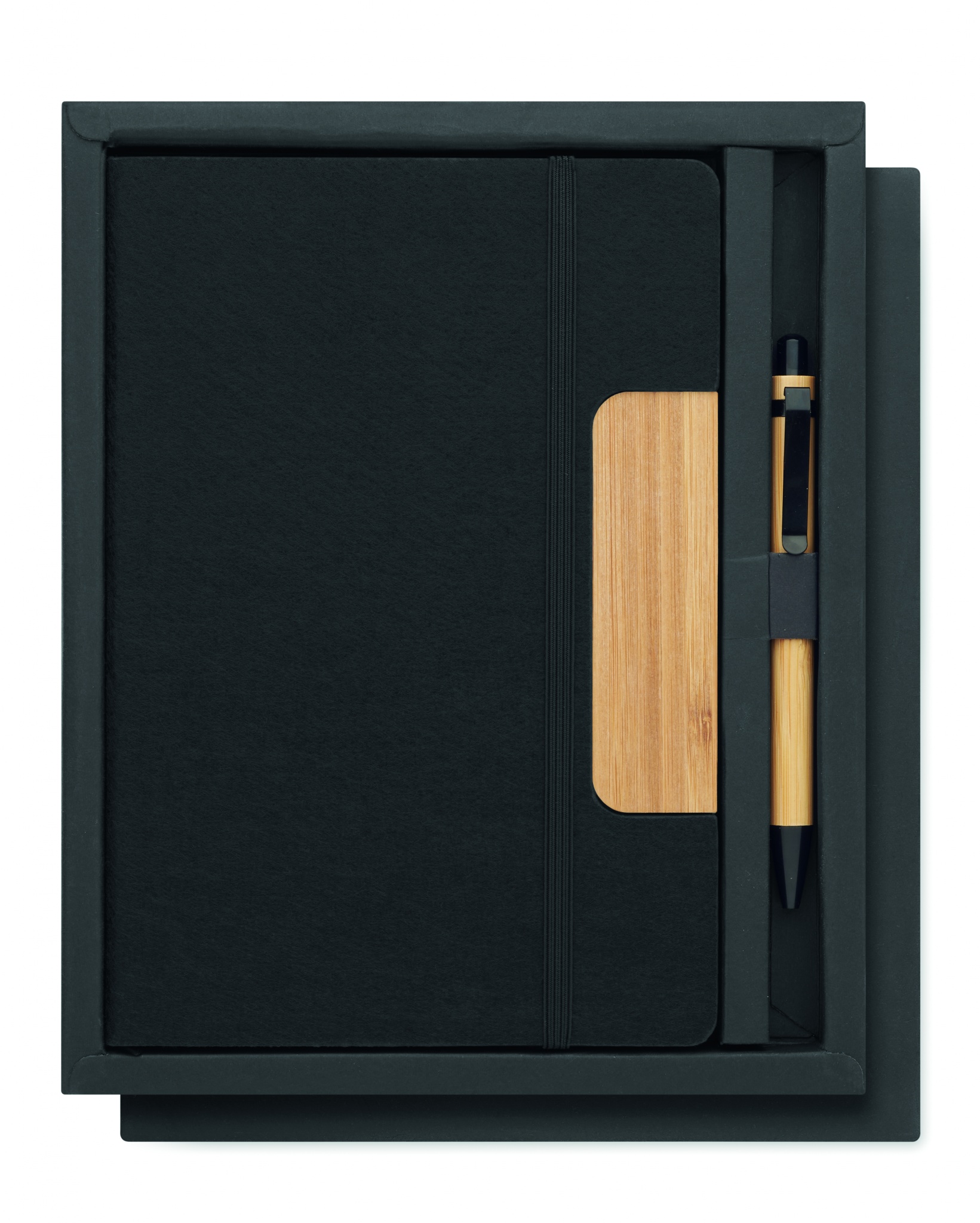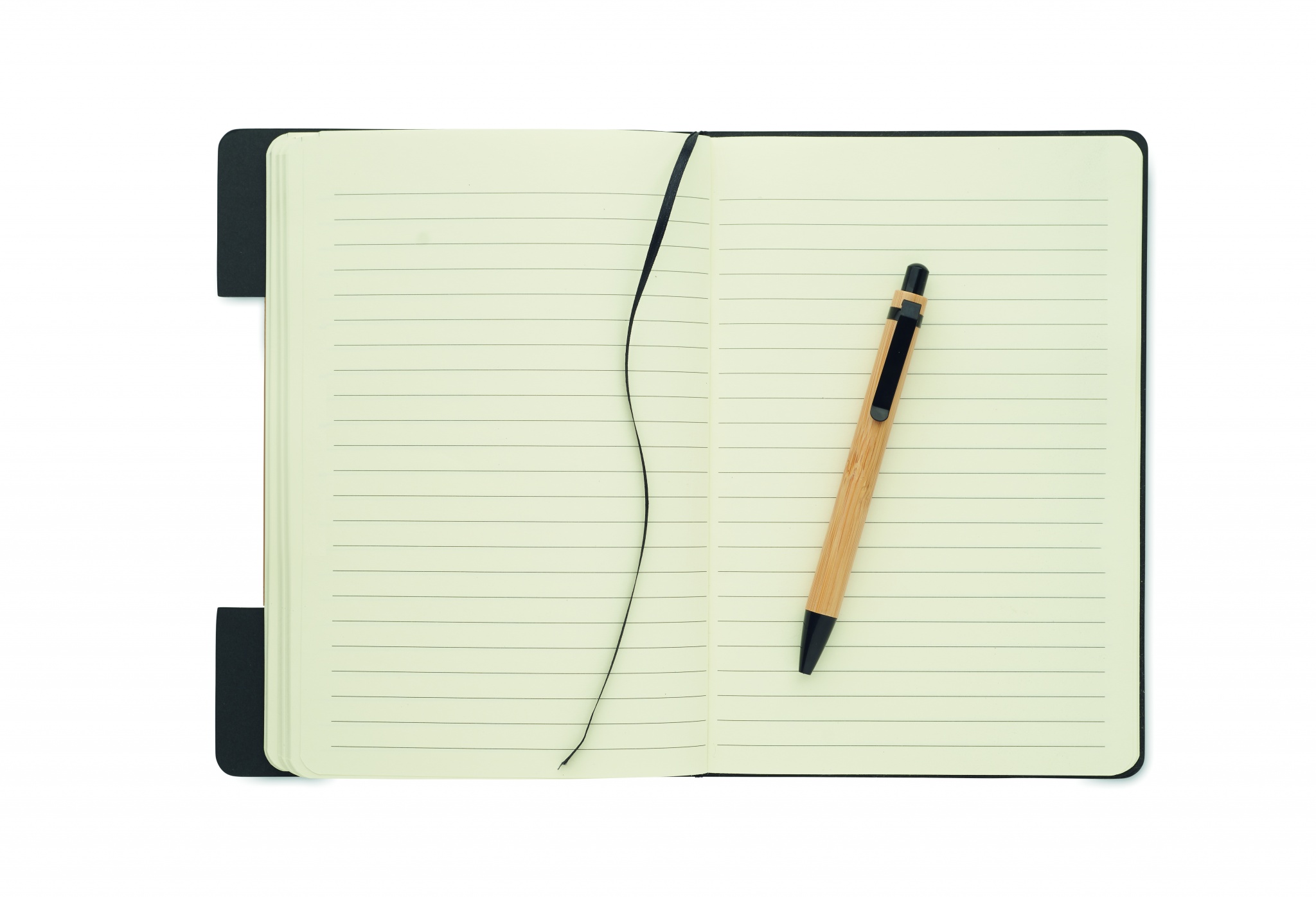 A5 RPET-huopakantinen kovakantinen muistikirjasetti, jossa on puhelinteline ja bambuputkella varustettu kuulakärkikynä. 160 viivoitettua sivua kierrätyspaperista (80 arkkia). Joustava sulkuhihna. Nauhallinen kirjanmerkki. Sininen muste.