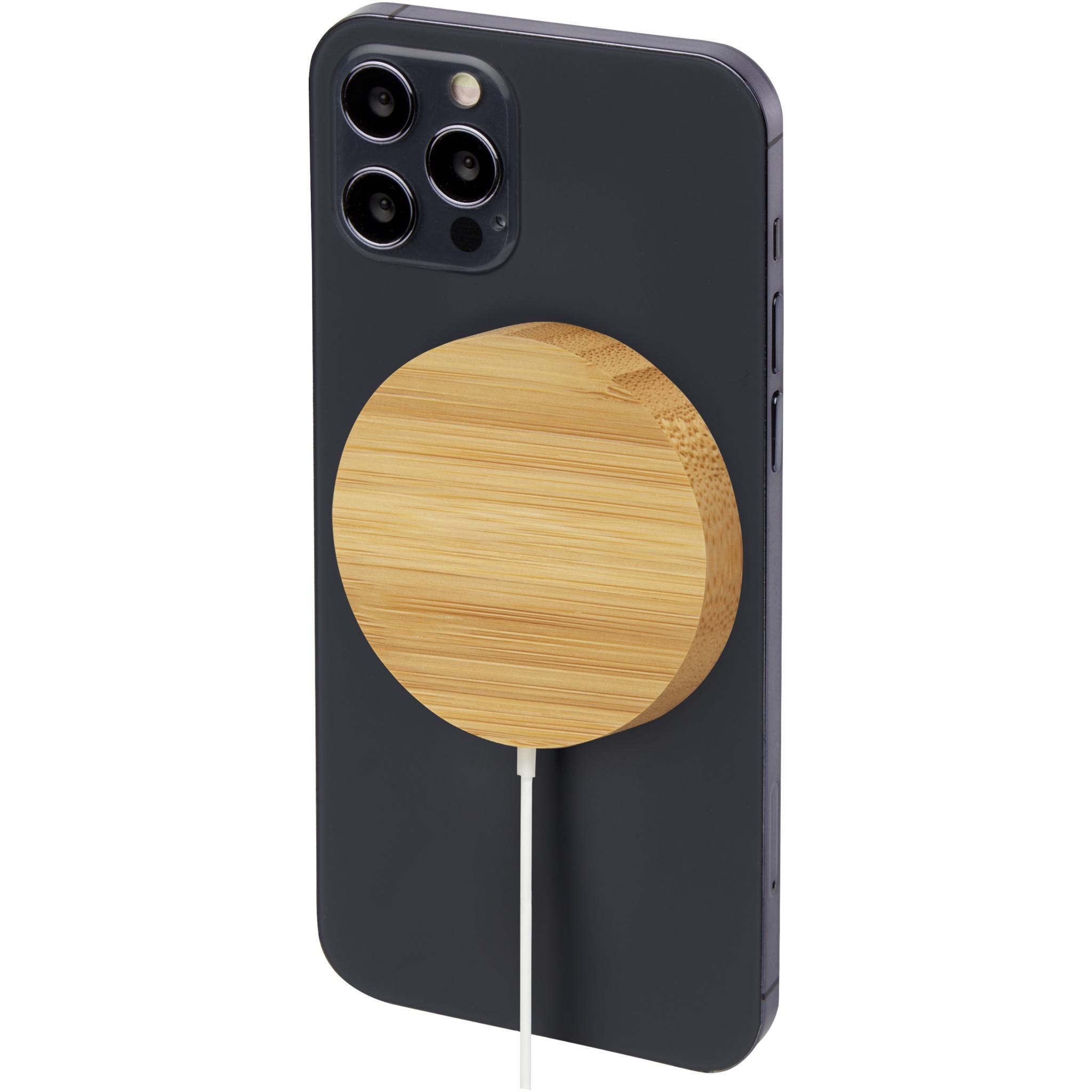 Magneettinen bambusta valmistettu langaton latauslevy, joka voidaan kiinnittää puhelimen takaosaan (iPhone 12 /iPhone 12 Pro /iPhone 12 Pro MAX) laitteen lataamiseksi. Tämä 10 W:n langaton laturi on yhteensopiva kaikkien Qi -laitteiden kanssa (iPhone 8 tai uudempi ja Android -laitteet, jotka tukevat langatonta latausta), ja muissa puhelimissa sitä voidaan käyttää tavallisena langattomana latausalustana. Mukana tulee ylimääräinen kaksinkertaisella teipillä varustettu metallirengas, jotta tuote on yhteensopiva muiden älypuhelimien kanssa, joissa on langaton latausmahdollisuus. Toimitetaan lahjapakkauksessa, joka sisältää käyttöohjeet (molemmat kestävistä materiaaleista).