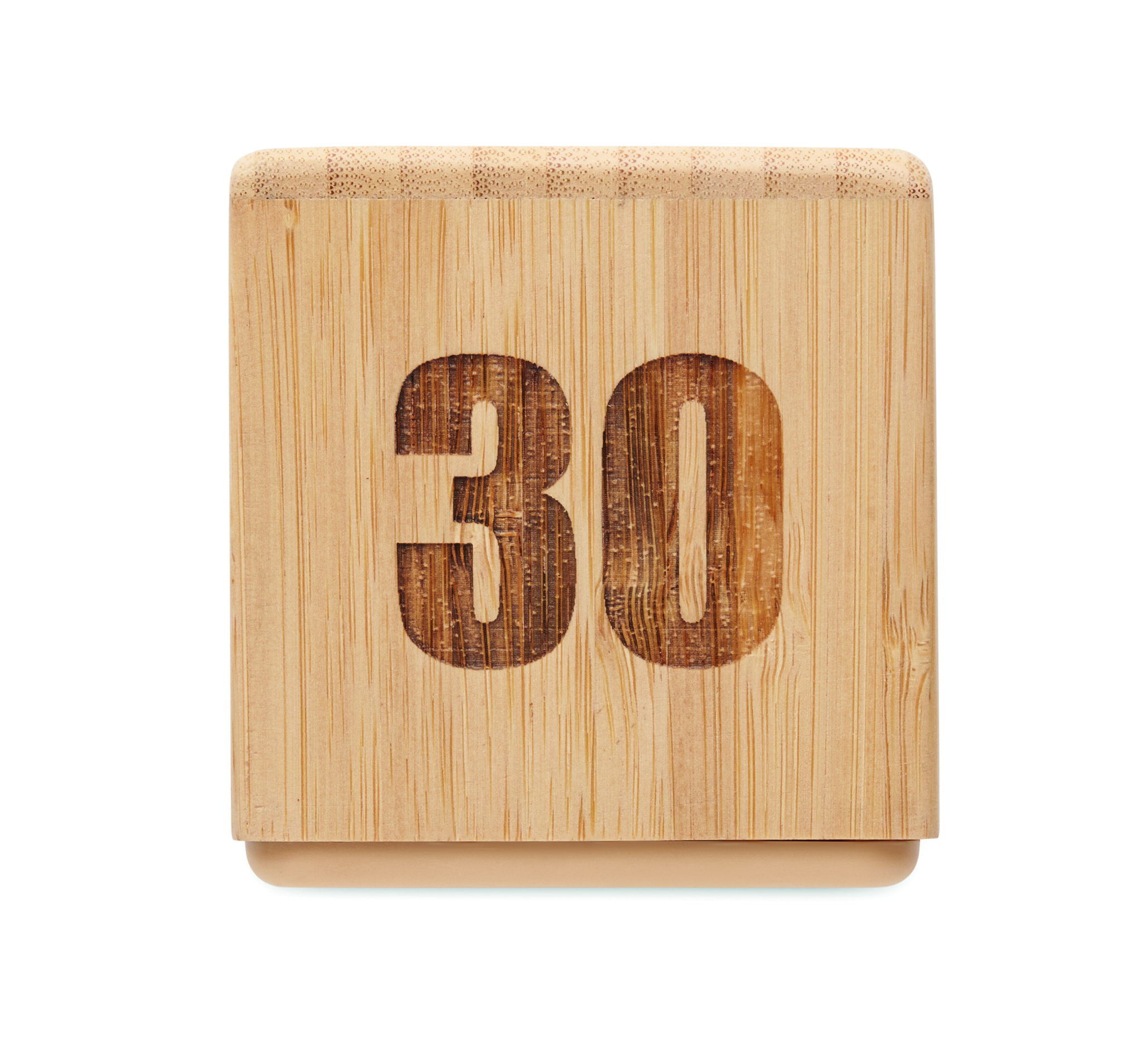 Bambukierre torkkuajastin, jossa on lähtölaskenta. Paristokäyttöinen. Mukana 2 x AAA-paristoa
