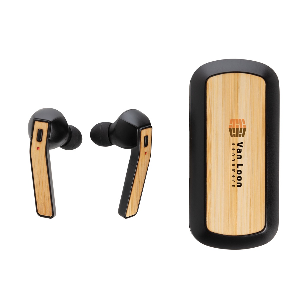 Logo trade liikelahja mainoslahja tuotekuva: Bambuiset free flow -kuulokkeet kotelossa
