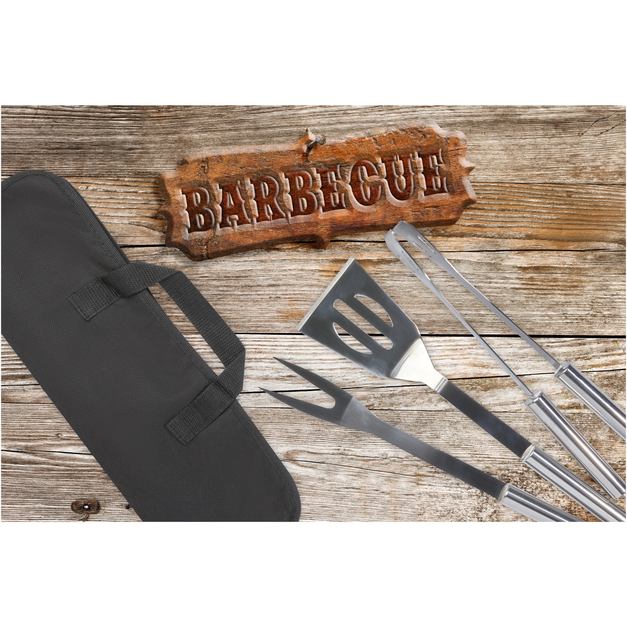 3-osainen grillausvälinesarja, jossa on lasta (34,8 x 7,5 cm), haarukka (35,4 x 3,35 cm) ja pihdit (35 x 6,8 x 4 cm). Grillausvälineet toimitetaan kevyessä kotelossa, jossa niitä on helppo säilyttää ja kuljettaa. Tämä on erinomainen grillaustarvikesarja kotipihalle tai mukaan vietäväksi, kun grillaat ulkona ystävien ja perheen kanssa.