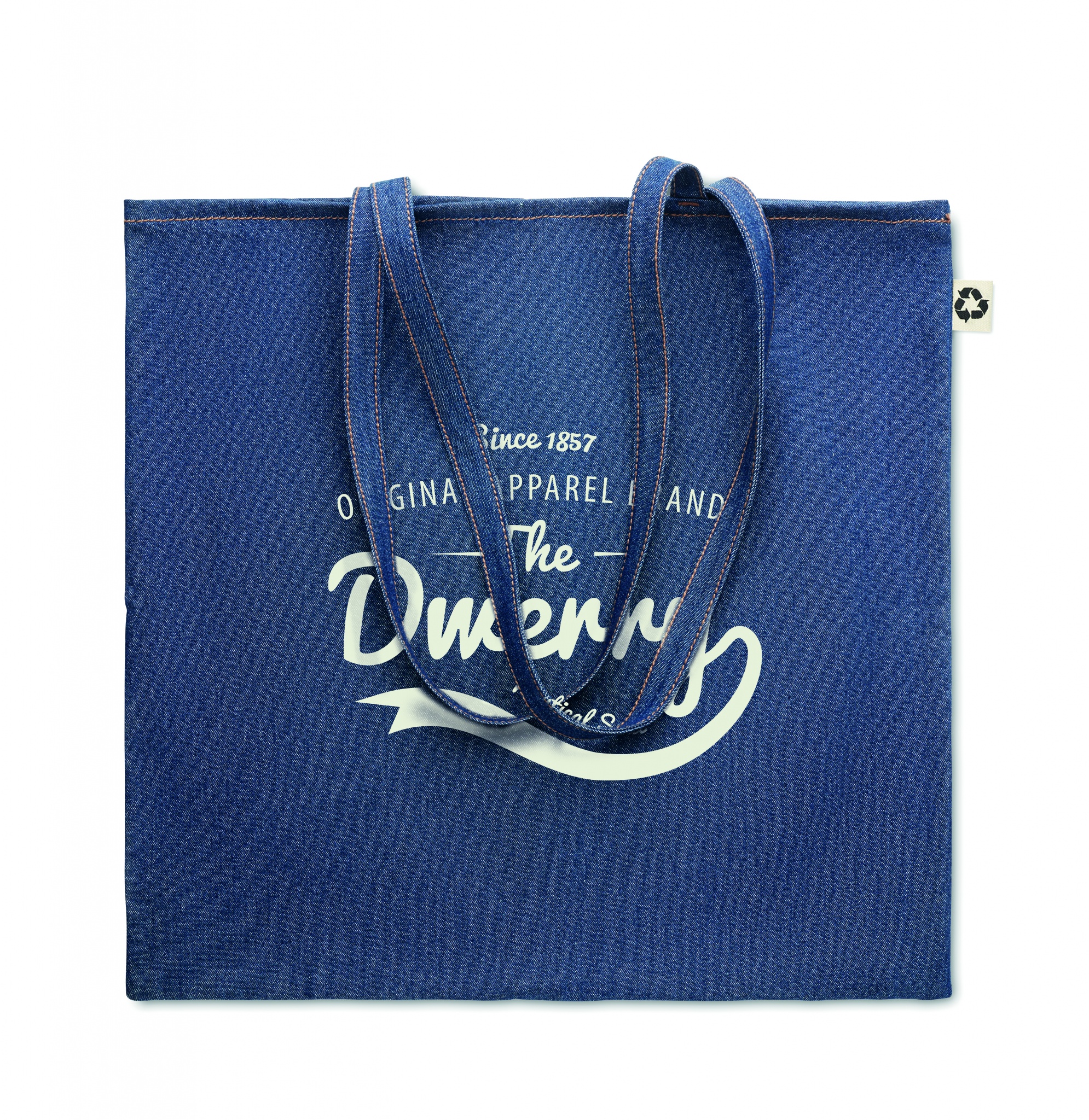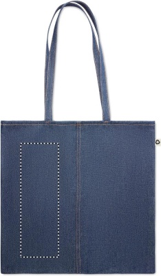 250 gr/m² denim kassi, valmistettu 50% kierrätetystä värjätystä puuvilla denimistä ja 50% normaalista puuvillasta.