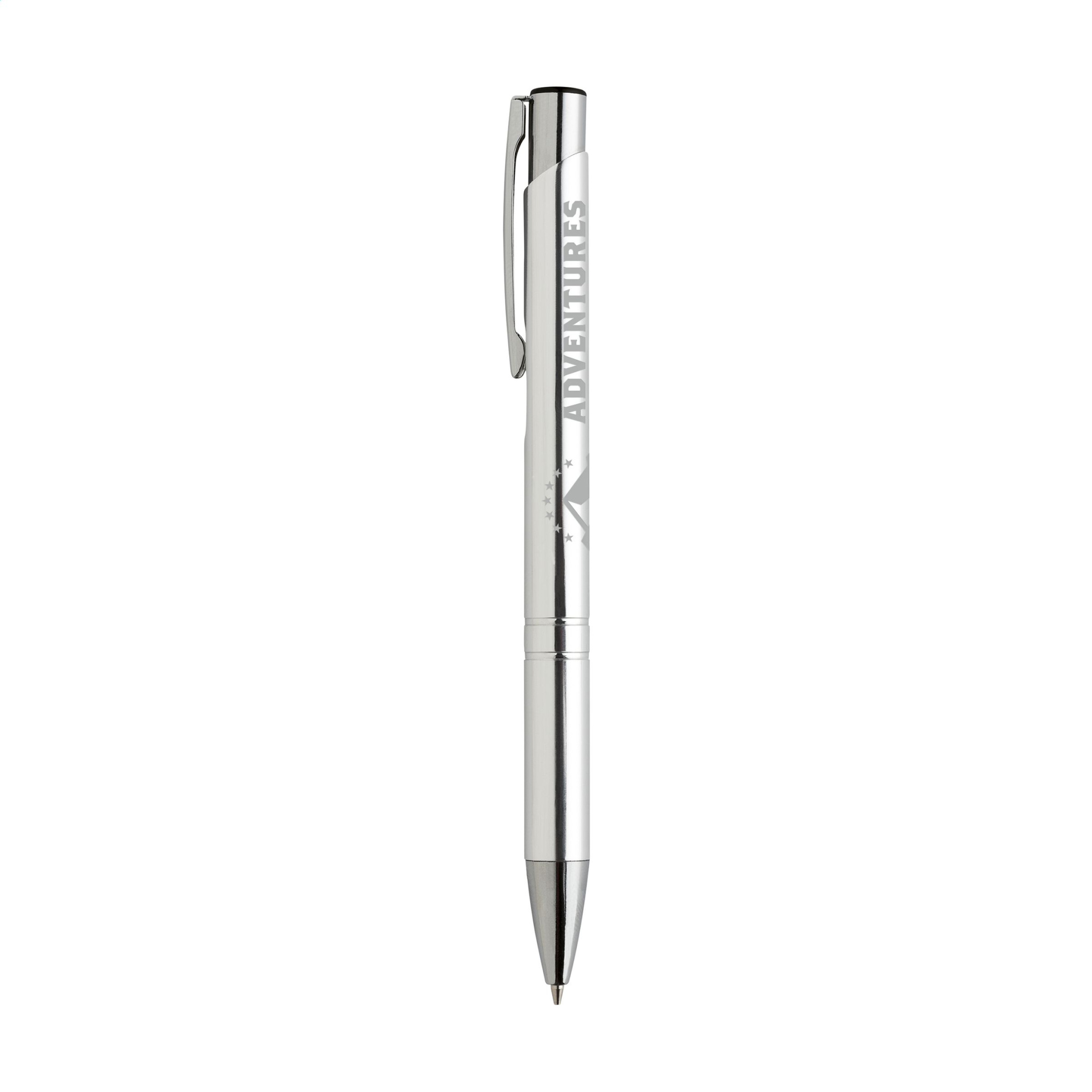 Sininen muste, alumiininen kuulakärkikynä kiiltävällä, metallisen ilmeellä piipulla ja metalliklipsillä.