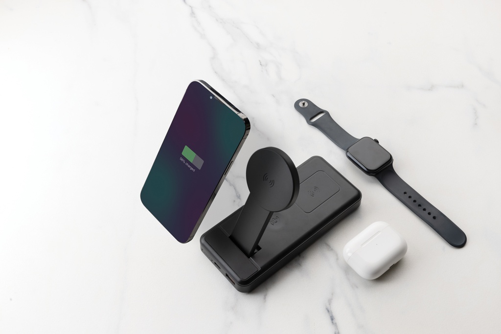 Ainutlaatuinen 3-in-1 10.000 mAh 15W virtapankki, jonka kotelo on valmistettu RCS-sertifioidusta kierrätetystä ABS-muovista. Kierrätetyn materiaalin kokonaismäärä: 22% tuotteen kokonaispainosta. Virtapankki sisältää pitkäkestoisen 10.000 mAh:n A-luokan litiumpolymeeriakun. Virtapankissa on kokoontaitettava integroitu 15W:n magneettinen langaton latausteline ja 5W:n langaton toissijainen laturi, jota voidaan käyttää pienemmille langattomille tuotteille, kuten kuulokekoteloille, sekä kolmas 2,5 W:n kellolaturi IOS-kelloille. Virran merkkivalot ilmoittavat jäljellä olevan virran määrän. Tuote ja tarvikkeet PVC-vapaita. Mukana RCS-sertifioitu kierrätetty TPE-latauskaapeli. Pakattu FSC® mix -pakkaukseen. C-tyypin tulo 5V2.5A 9V2A 12V1.5A; C-tyypin lähtö:5V3A 9V2.22A 12V1.67A; USB-A lähtö:5V3A 9V2A 12V1.5A 5V4.5A.