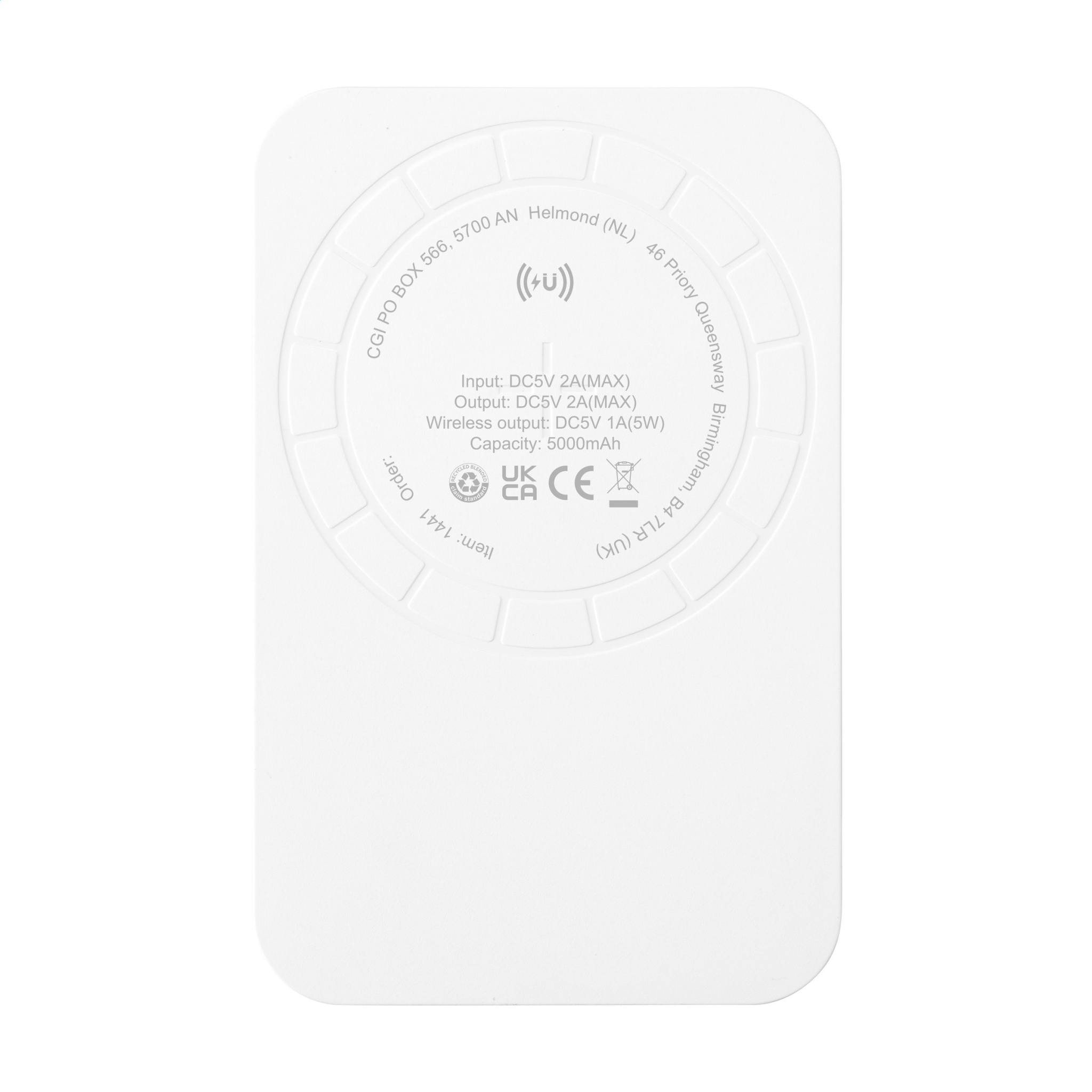 Kierrätetystä ABS:stä valmistettu magneettinen langaton virtapankki, jossa on sisäänrakennettu polymeeriakku (5000 mAh). Työnnä laturi matkapuhelimesi takaosaan ladataksesi laitteesi. Tämän laturin integroidut magneetit (17 korkealaatuista lämmönkestävää N52H) on kohdistettu täydellisesti ja varmistavat aina, että puhelimesi on oikeassa asennossa optimaalista latausta varten. Mukana on myös ylimääräinen magneettinen metallirengas, joka tukee ei-magneettisten langattomien ladattavien älypuhelimien lataamista. Yhteensopiva kaikkien mobiililaitteiden kanssa, jotka tukevat langatonta QI-latausta (uusimman sukupolven Android ja iPhone 8 ja uudemmat). Muissa puhelinmalleissa tätä tuotetta voidaan käyttää tavallisena langattomana laturina. Type-C tulo ja lähtö: 5V/2A. USB-lähtö: 5V/2A. Langaton lähtö 5V/1A 5W. Sisältää Type-C-latauskaapelin ja käyttöohjeen. Sekä tuote että sen lisävarusteet ovat PVC-vapaita. RCS-sertifioitu. Kierrätysmateriaali yhteensä: 30 %. Jokainen tuote on pakattu erikseen.