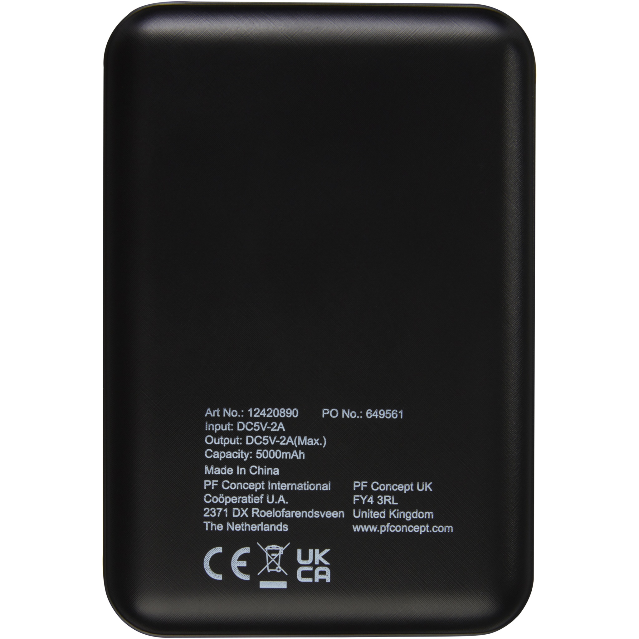 Litteä ja kestävä varavirtalähde 5000 mAh:n polymeeriakulla. Etupaneeli voidaan laserkaivertaa jolloin logomerkintä valaistuu, kun varavirtalähde kytketään päälle tai sitä käytetään. Lähtö: 5 V / 2 A. Tulo: 5 V / 2 A. Lisävarustekaapelia ei toimiteta ympäristön säästämisen vuoksi.