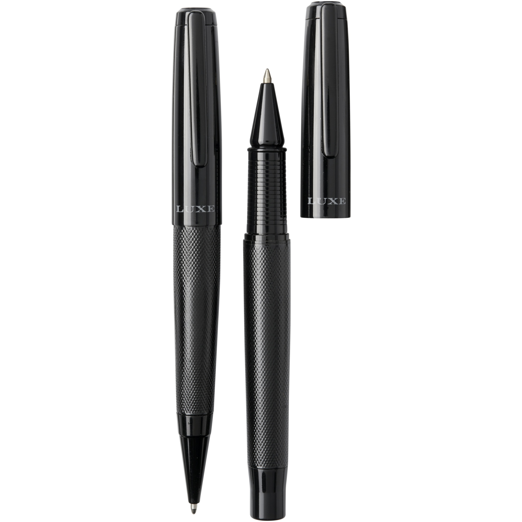 Kuulakärkikynä ja pallokärkikynä lahjapakkauksessa, musta ylä- ja alakotelo, kiiltävä pinta, toimitetaan Luxe-lahjapakkauksessa. Kuulakärkikynä: 14 cm x 1,45 cm, paino: 40 g, kirjoituspituus: 800 m. Pakkokärkikynä: 13,8 cm x 1,45 cm, paino: 54 g, kirjoituspituus: 400 m.