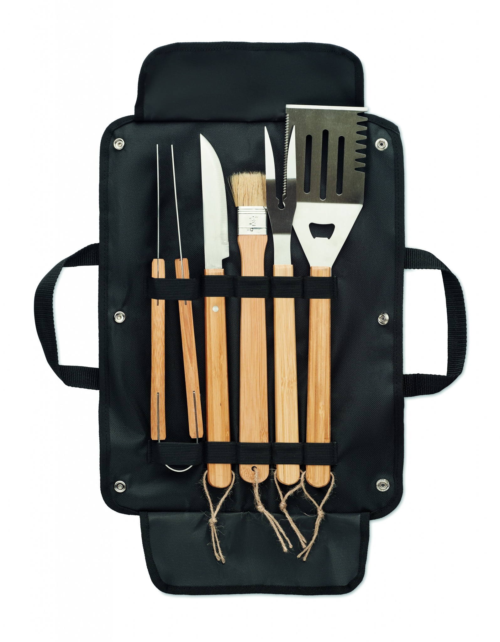 5 osainen ruostumattomasta teräksestä valmistettu grillaus setti puisilla kahvoilla, sisältää grillilastan, -veitsen, -pihdit, -haarukan ja voitelu harjan. Pakattuna vahattuun kangaspussiin. Luonnollisen materiaalin vuoksi, tuotteiden värissä/ koossa saattaa olla erinäisyyksiä ja tämä voi vaikuttaa painatuksen lopputulokseen.