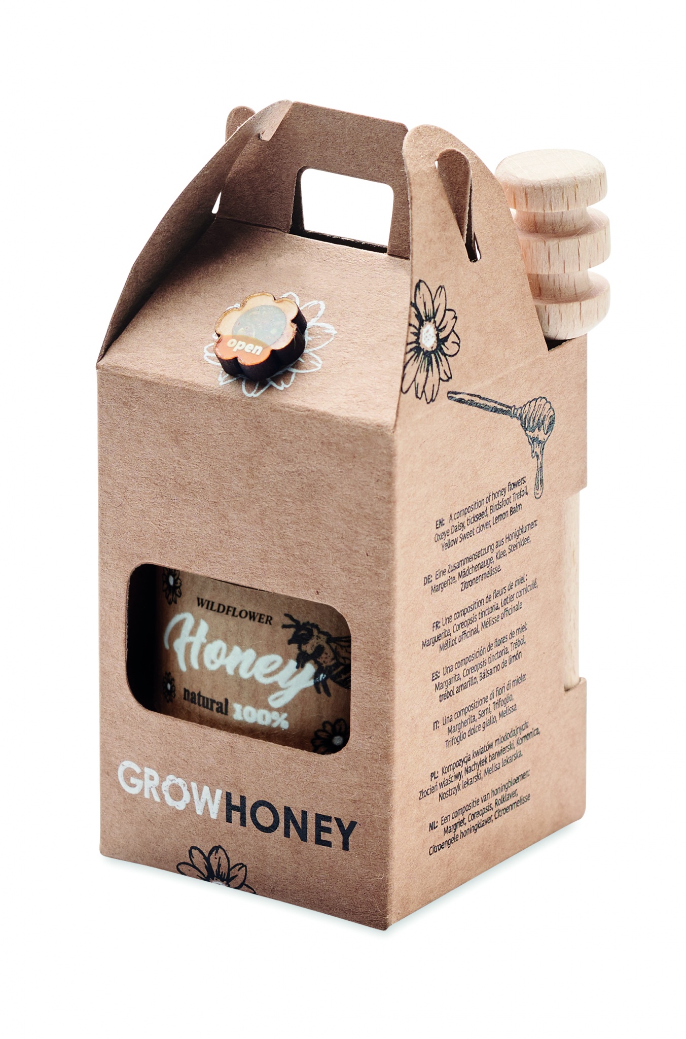 Luonnonkukka 50 gr hunajapurkki ja hunaja lusikka. Sisältää villikukan siemeniä, pakattuna voimapapperi pakkaukseen. Eurooppa tuotantoa.