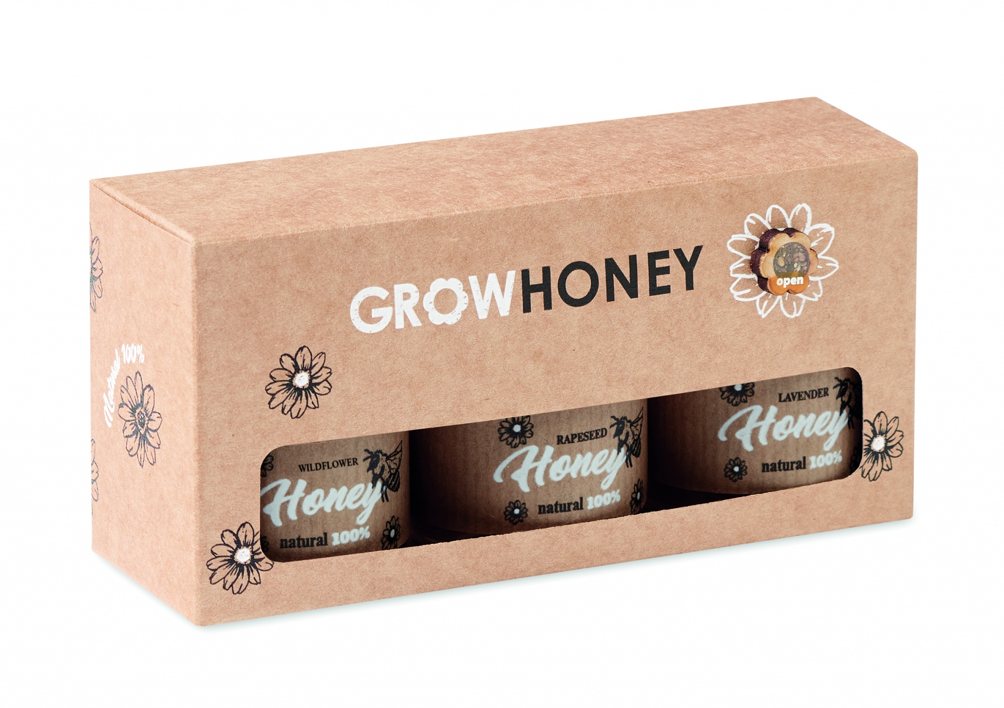 3 erilaista 50 gr hunajapurkkia luonnonkukka-, vadelma- ja rypsihunaja, sisältää puisen hunajalusikan. Pakattuna voimapaperi pakkaukseen, eurooppa tuotantoa.